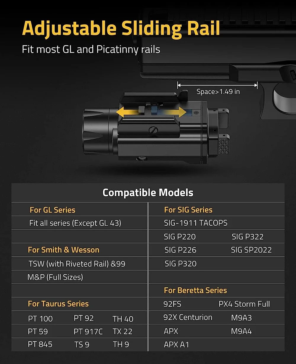 - La luz táctica LED está equipada con un ajuste de tornillo manual para adaptarse a los rieles guía GL y Picatinny. - La abrazadera del riel de nuestra luz táctica para pistola se puede ajustar entre 20 mm y 21 mm.Se adapta a riel MIL-STD-1913, rieles tamaño Glock 17/19, GEN5, perfecto para armas cortas como Glock 17, Glock 19, Sig Sauer1911, pistolas, pistolas, Springfield, Taurus, Beretta, Walther, Smith & Wesson, pistolas BB., pistola de airsoft, pistolas semiautomáticas, etc.