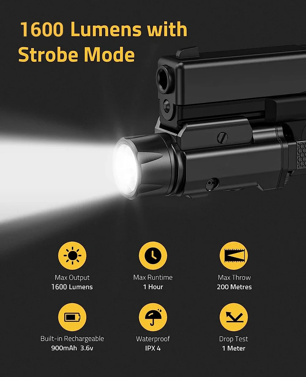 Luz LED para arma de 1600 lúmenes, ajustable, 3 modos, luz para pistola, lámpara estroboscópica LED recargable magnética, linterna para pistola compacta