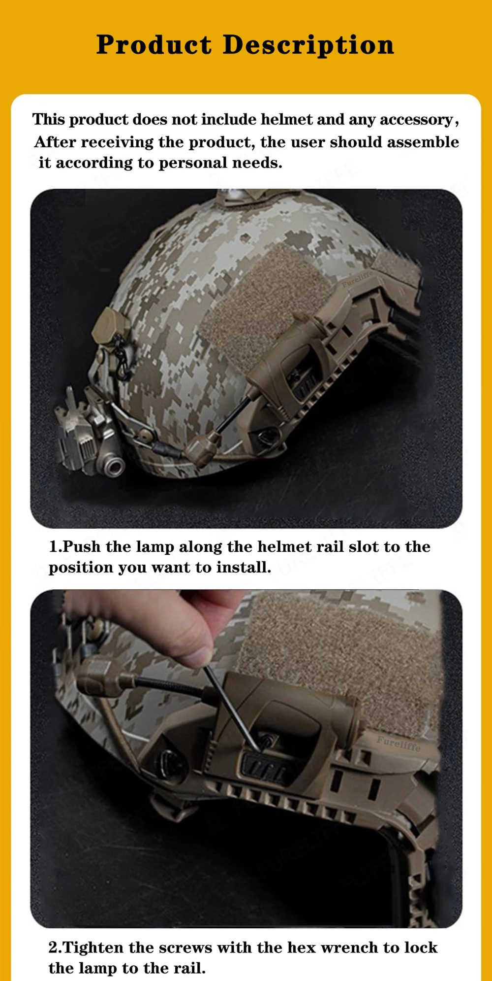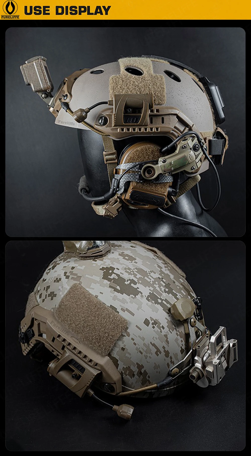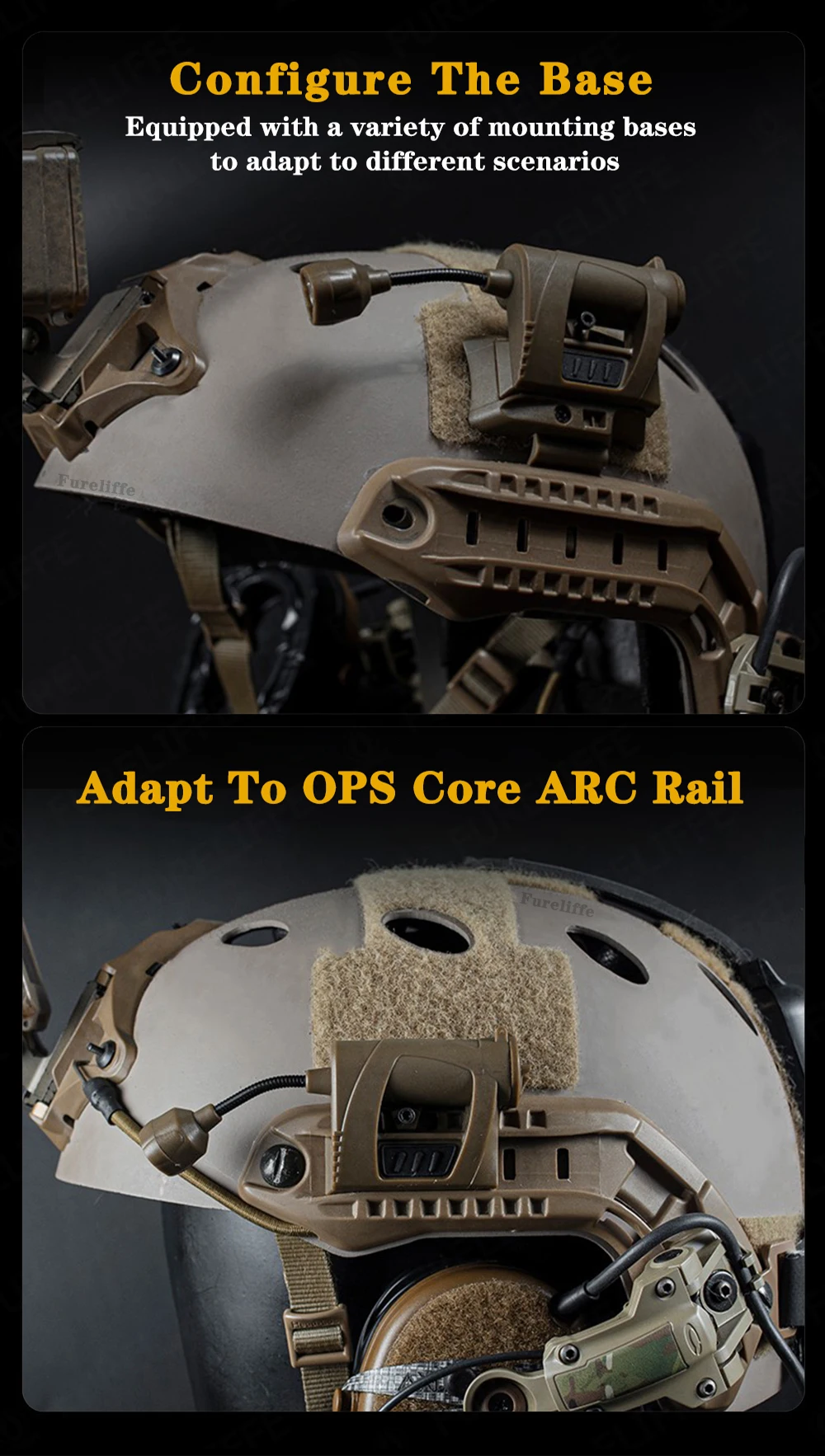 - Montaje lateral en casco.El producto está equipado con un clip y un adaptador de montaje en riel ARC para que pueda adaptarse a diferentes cascos tácticos.