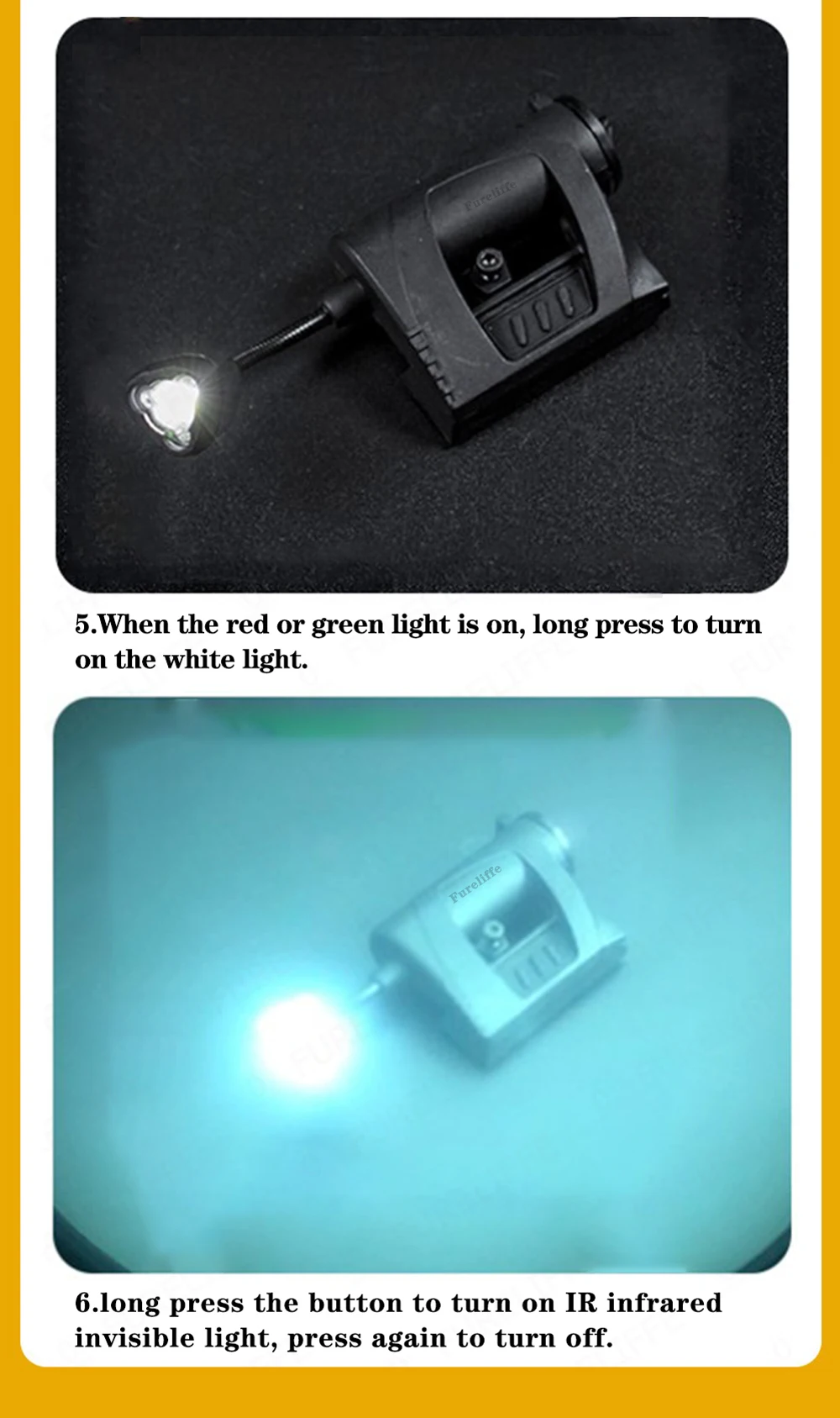- Dependiendo de sus necesidades, el interruptor se puede cambiar a visión nocturna infrarroja/invisible o cambiar a luz roja, luz verde o luz blanca.