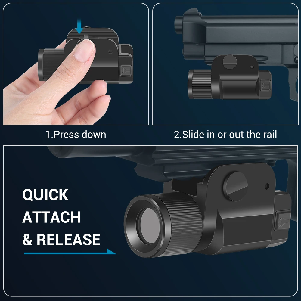 La abrazadera de riel de la linterna de pistola está diseñada para engancharse/separarse rápidamente del costado de un arma sin herramientas. Desliza con una mano la linterna Picatinny en el riel manteniendo las manos alejadas del bozal al conectar/separar.