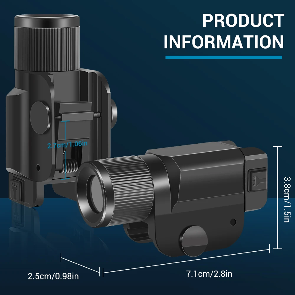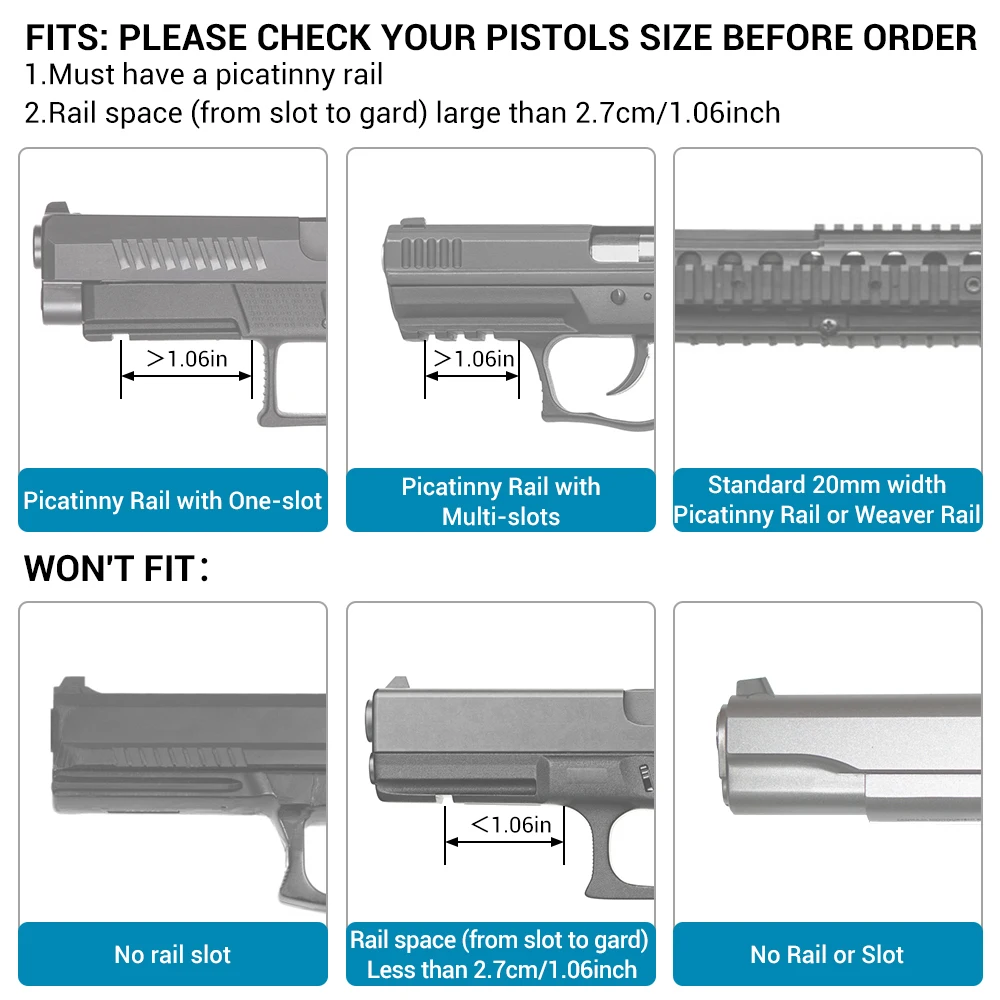 La linterna de la pistola pesa alrededor de 70g/2,47 oz, tamaño: 3,8 cm x 2,5x7,1/2,8x0,98x1,5 pulgadas. Linterna compacta y ligera de montaje en Riel, apta para la mayoría de pistolas con riel Picatinny. (La ranura del protector del gatillo debe ser mayor de 2,7 cm/1,06 pulgadas).