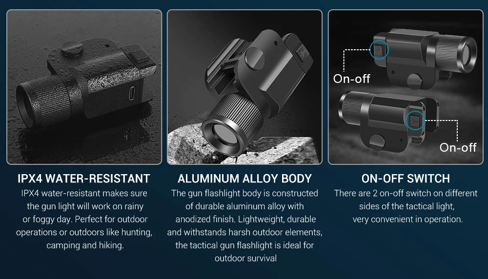 IPX4 resistente al agua asegura que la luz de la pistola funcione en días lluviosos o con niebla. Perfecto para operaciones al aire libre o al aire libre como caza, camping y senderismo.