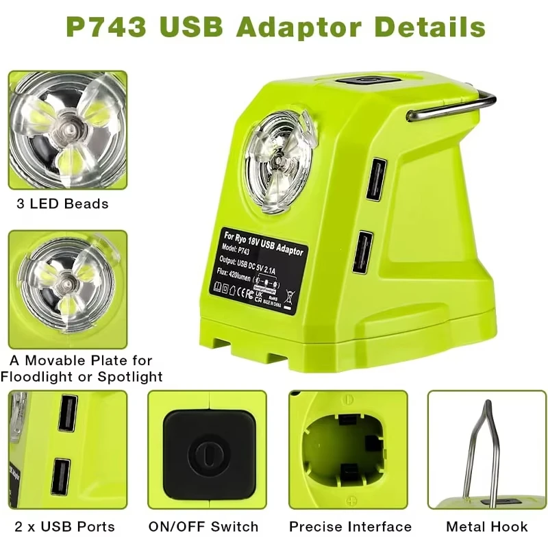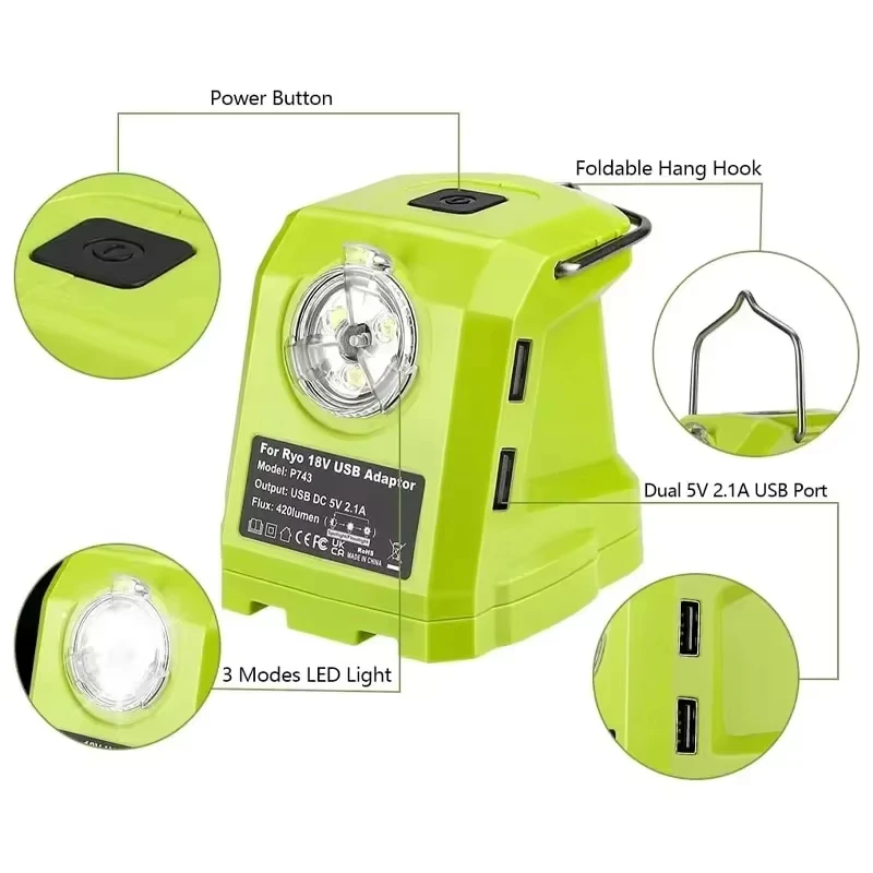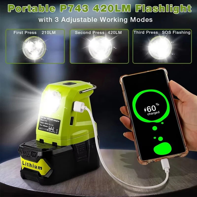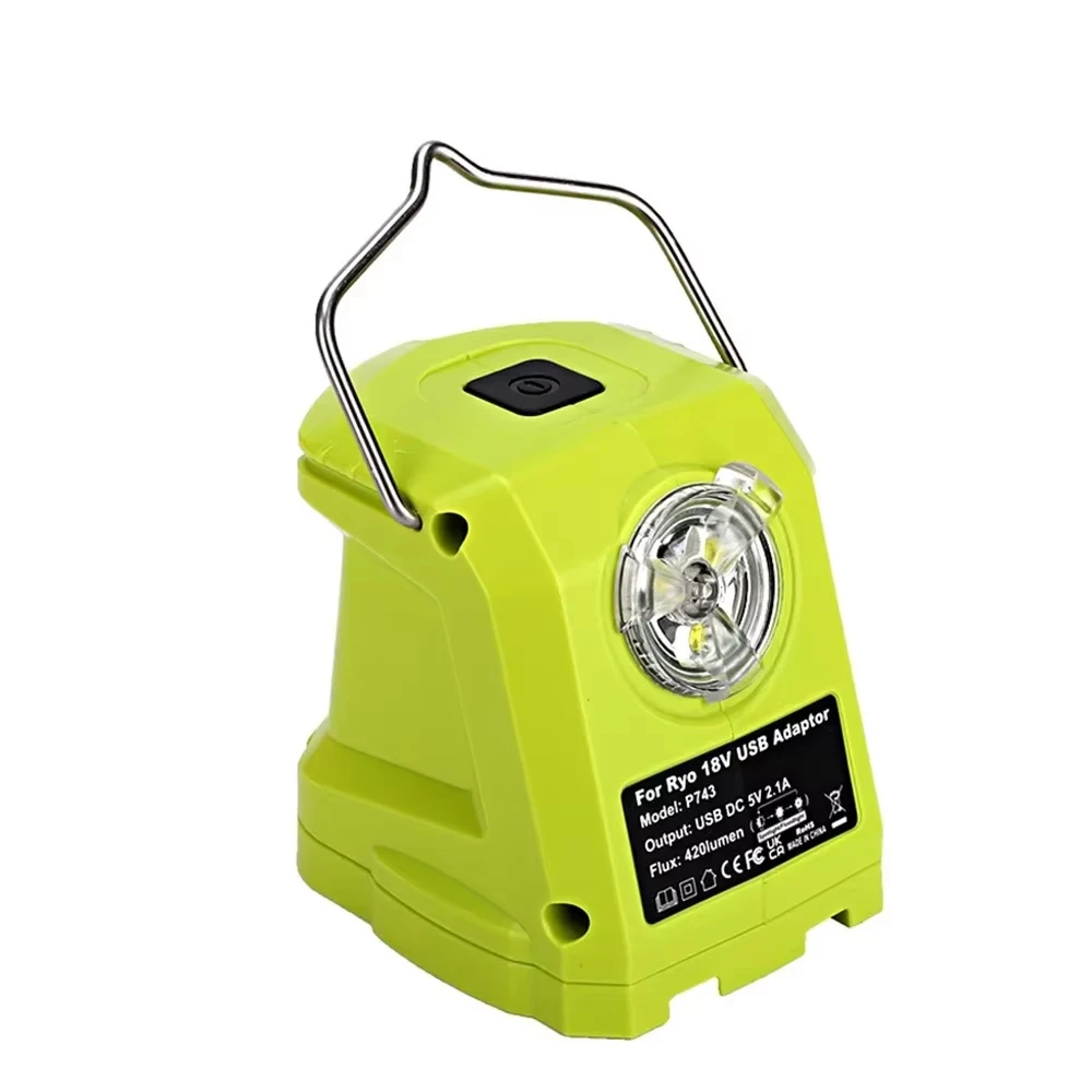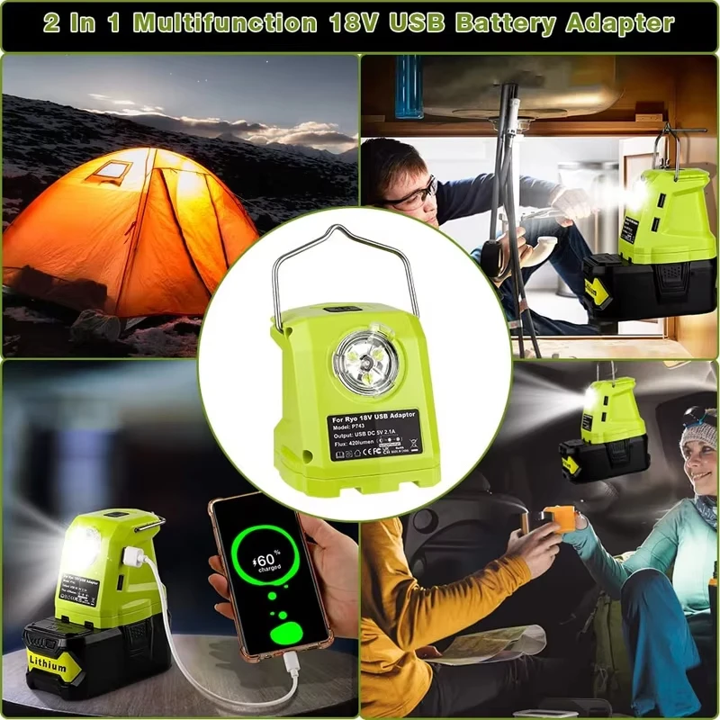 No solo un adaptador de batería para Ryobi de 18 V, sino una luz de emergencia, una luz de trabajo LED y una linterna para acampar al aire libre.