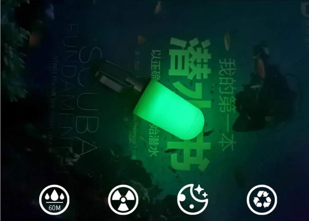 Scope of use: It can be used in the underwater environment, suspended on BCD, breathing regulators, gas cylinders, and used for luminous signs.