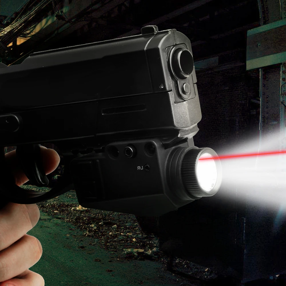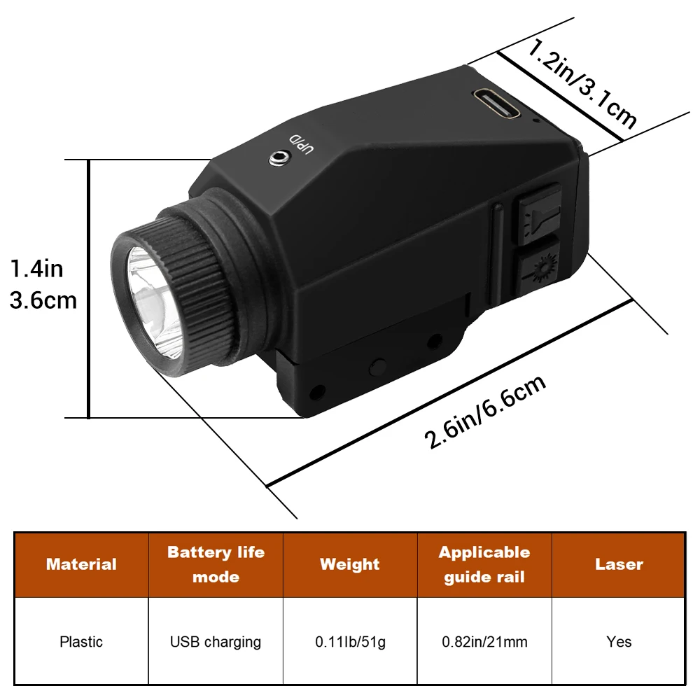 【Modos múltiples】El combo de láser y luz LED blanca de 500 lm ofrece modos estables/estroboscópico; Solo láser; Solo linterna y luz de pistola fija/estroboscópica + láser.
