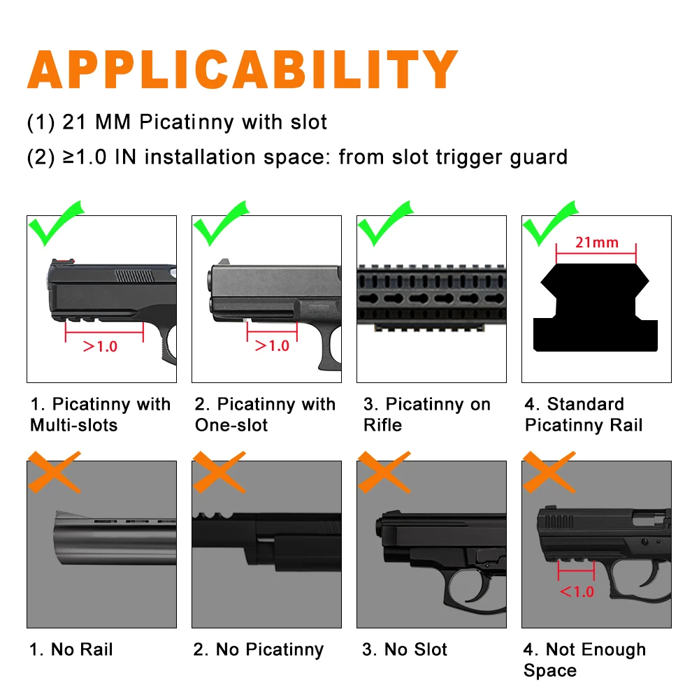 【Vista láser brillante y ajustable】La salida de la mira láser para pistola es de clase IIIA, 5 mW.Afine lentamente la elevación y el devanado de forma interactiva; solo una dirección puede bloquear o dañar las roscas.