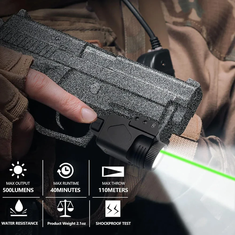 Luz de pistola de armas de 500 lúmenes, mira láser combinada, linterna de pistola de carga magnética con mira láser roja y verde para riel 1913 o GL