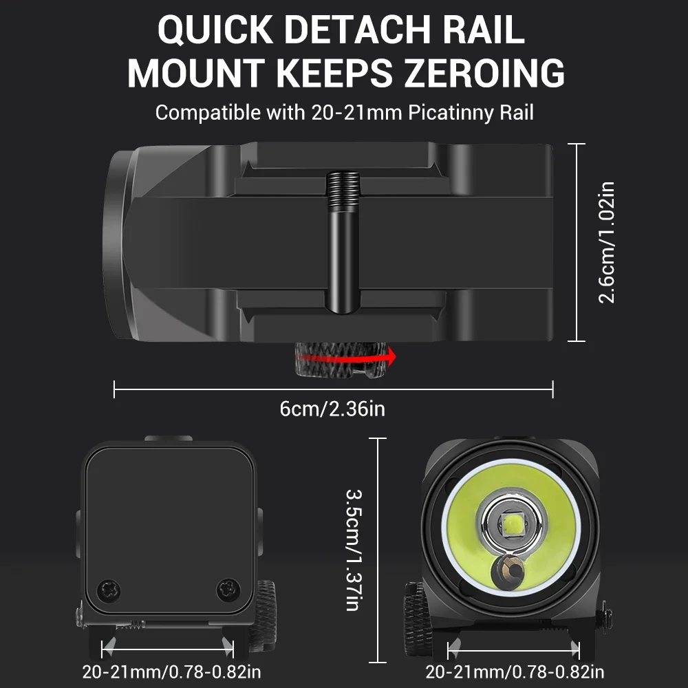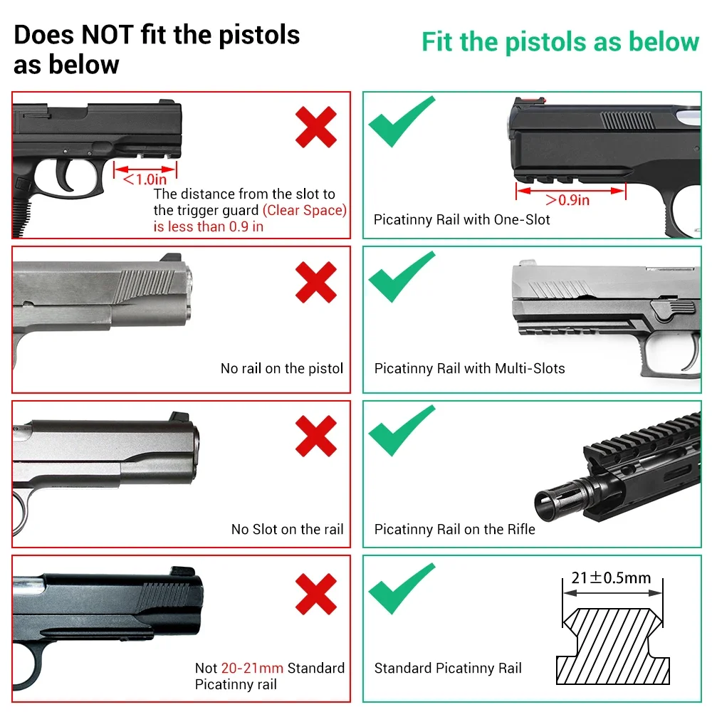 Está diseñado específicamente para montarse en rieles Picatinny de 20-21 mm y se puede colocar o quitar fácilmente del arma de fuego.Su diseño compacto y liviano garantiza que no agregue peso ni volumen innecesarios al arma de fuego.