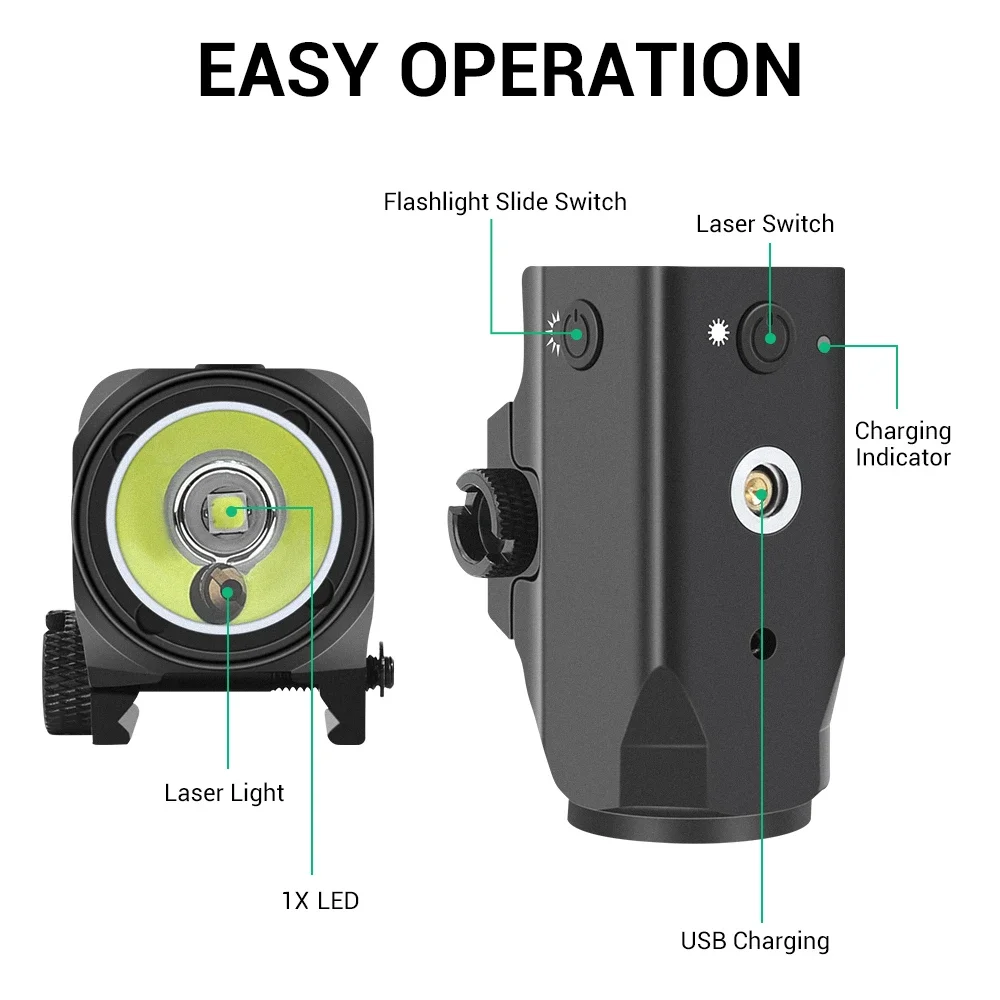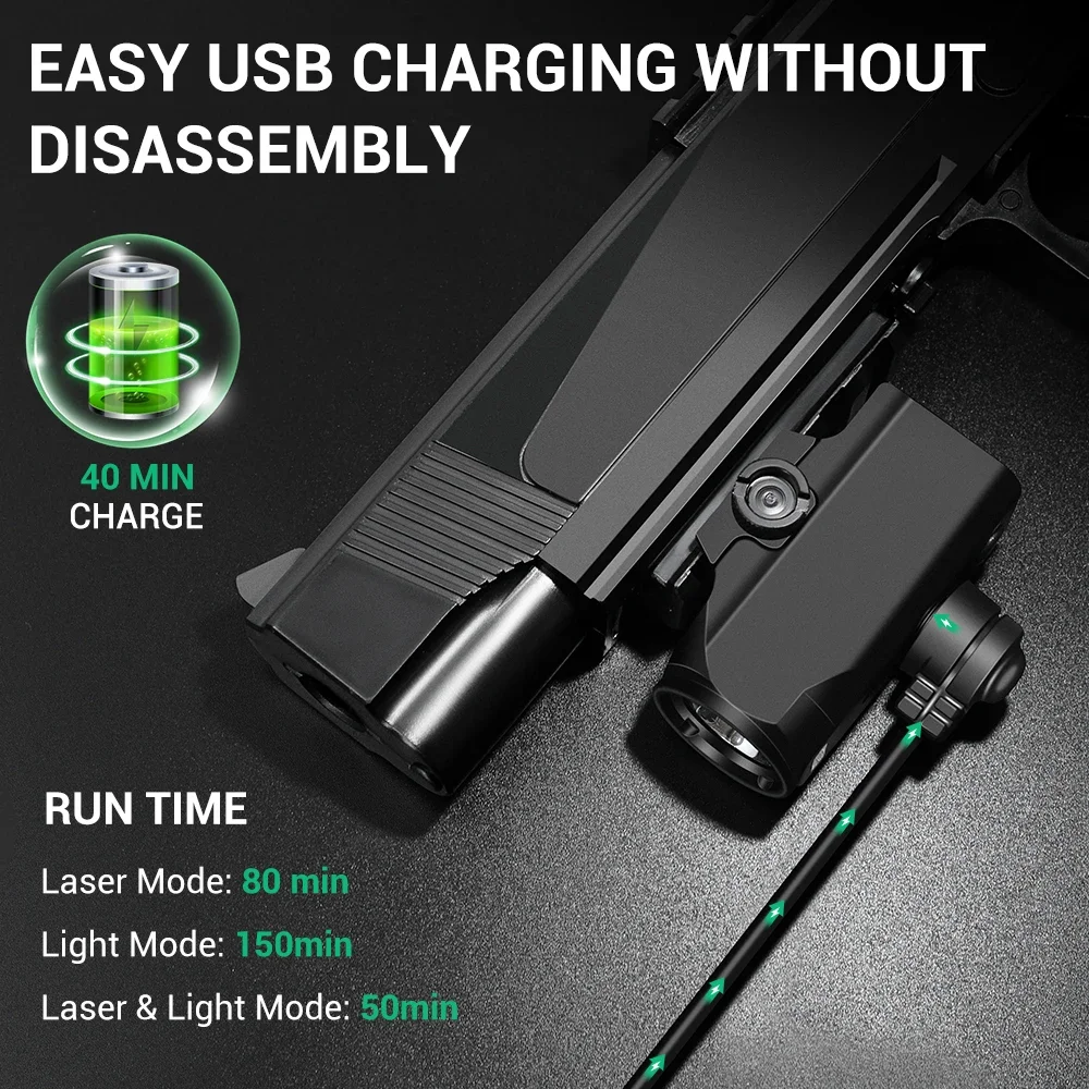 Combina luz blanca y láser verde (o rojo), proporcionando orientación precisa con un láser de clase IIIa e iluminando objetivos hasta 500 m de distancia con 800 lúmenes de luz blanca, lo que lo hace útil en condiciones de poca luz.