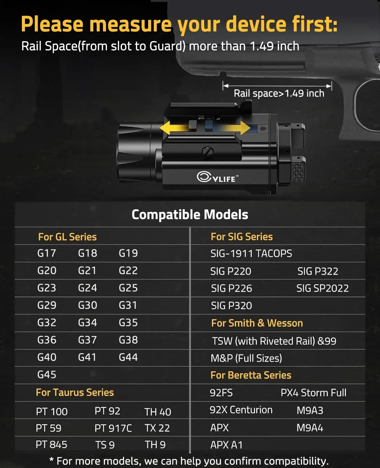 COMPATIBLE Y CONFIABLE: la luz láser verde CVLIFE para pistola se ha actualizado con un mecanismo de liberación rápida y un posicionamiento ajustable (adelante y posterior) para adaptarse a diferentes estilos de montaje.Es compatible con la mayoría de las series GL (excepto GL43) y los rieles Picatinny 1913 de 21 mm.La luz 126 g es fácil de transportar sin estrés.