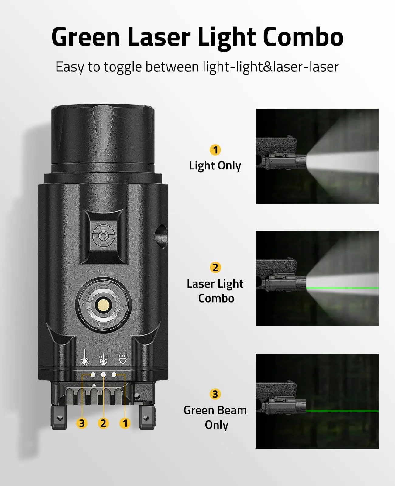 MÚLTIPLES MODOS DE LUZ: la linterna de pistola tiene 3 modos: solo linterna, solo láser y combinación de linterna y láser.Fácil de cambiar entre tres modos deslizando el botón.Haga clic en el interruptor una vez para ver el modo de luz fija y dos veces para el modo estroboscópico.La salida del láser verde de la pistola es inferior a 5 mW y la clase del láser es IIIA.