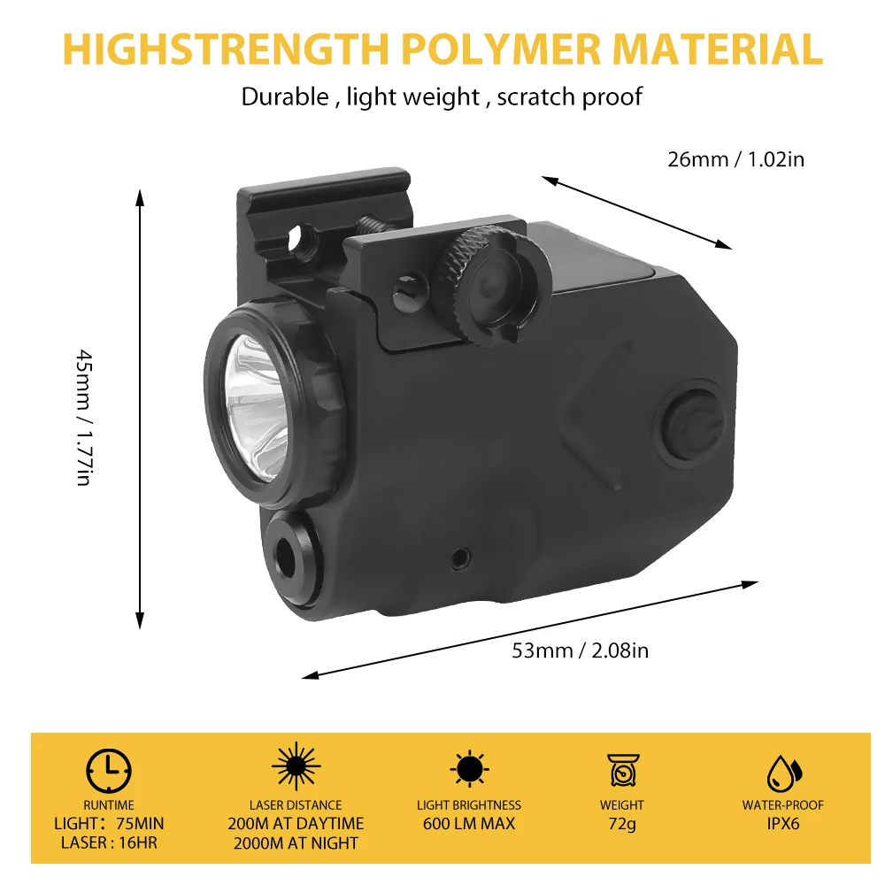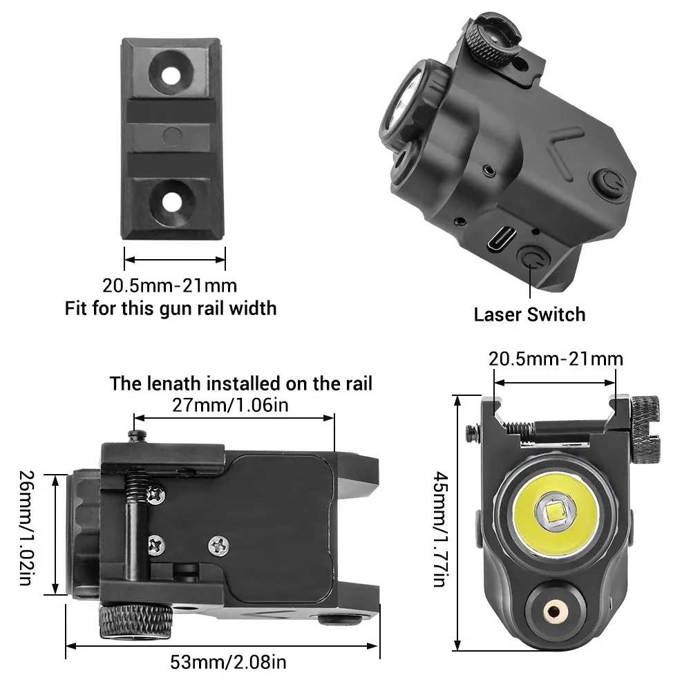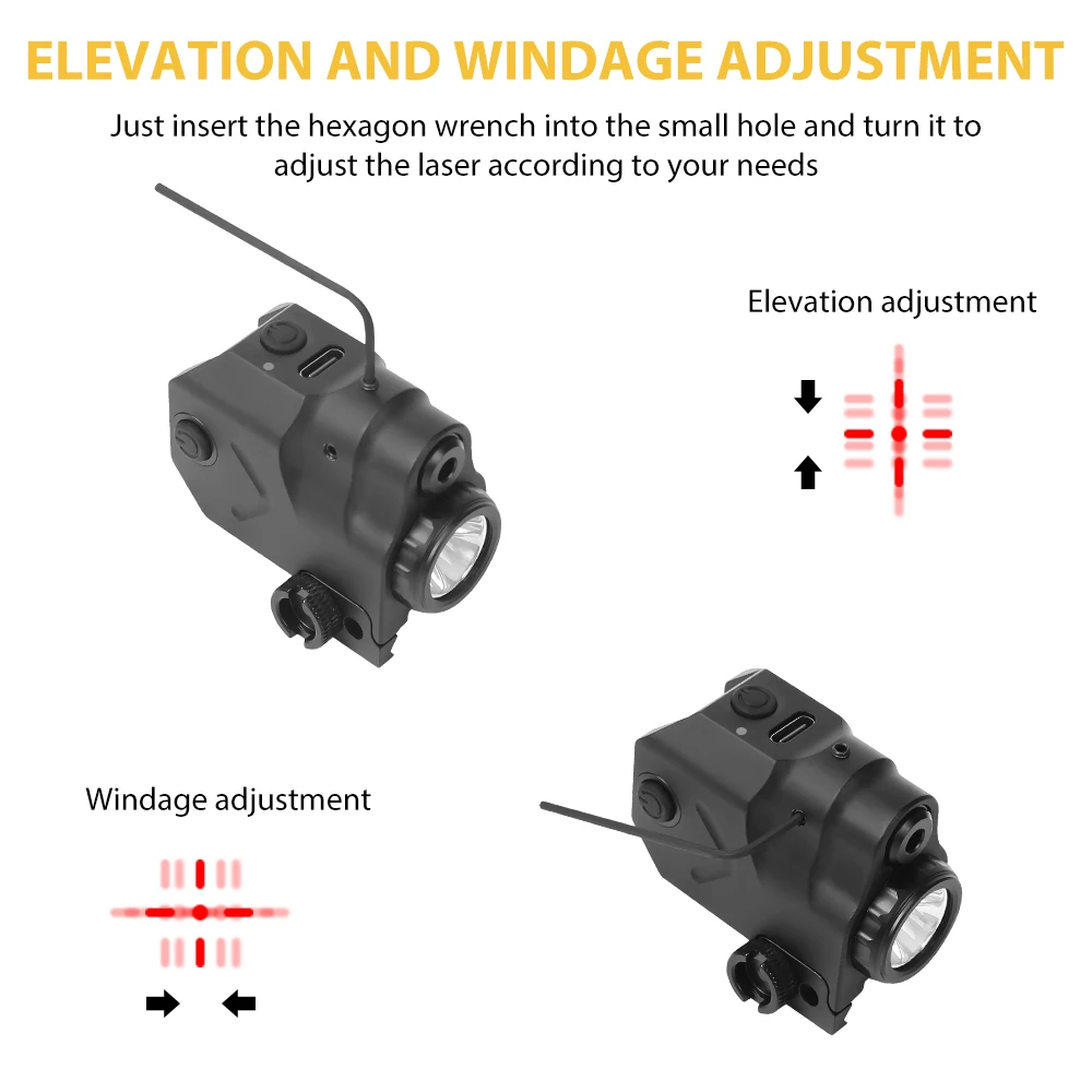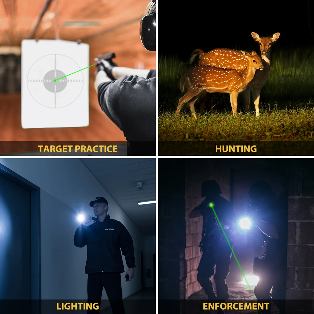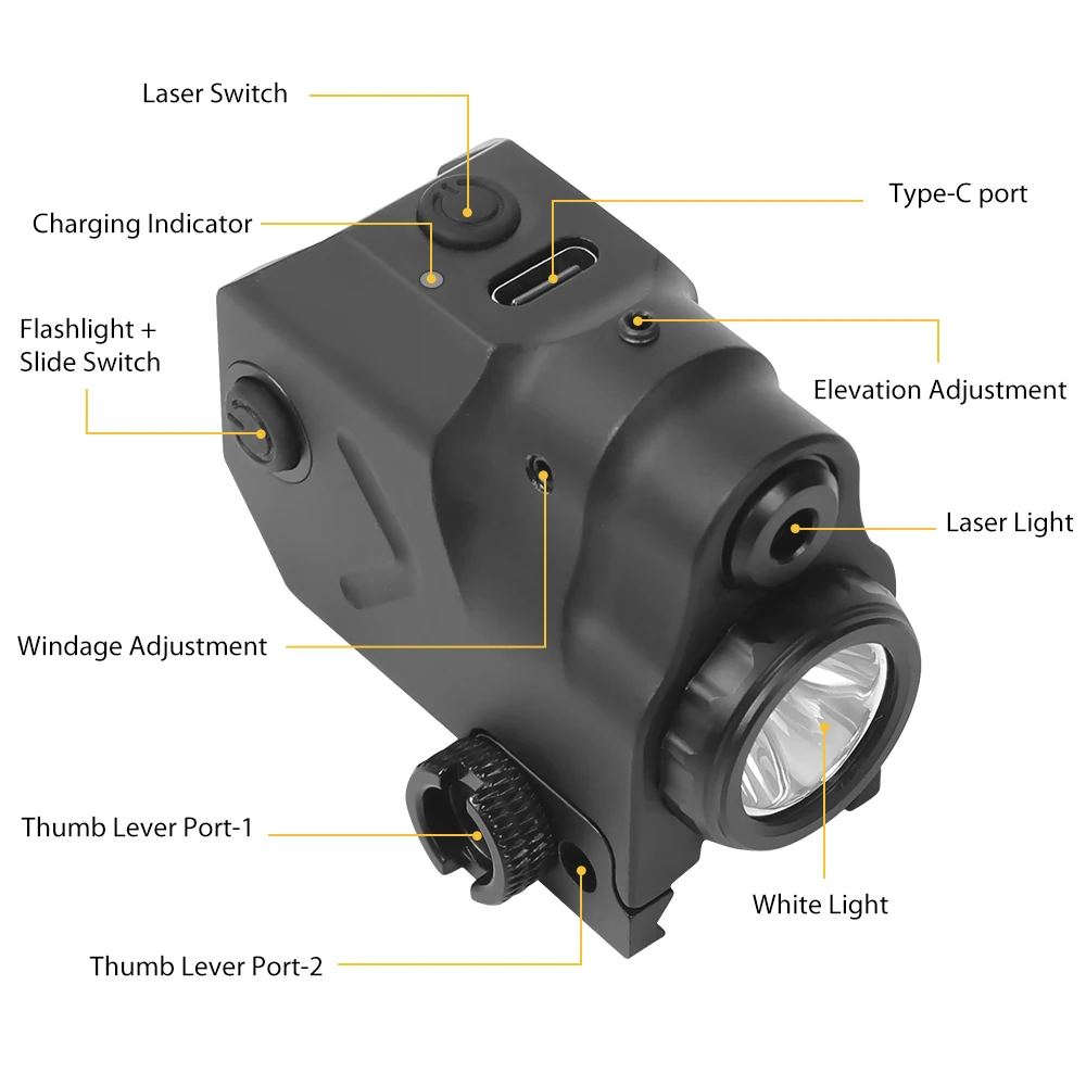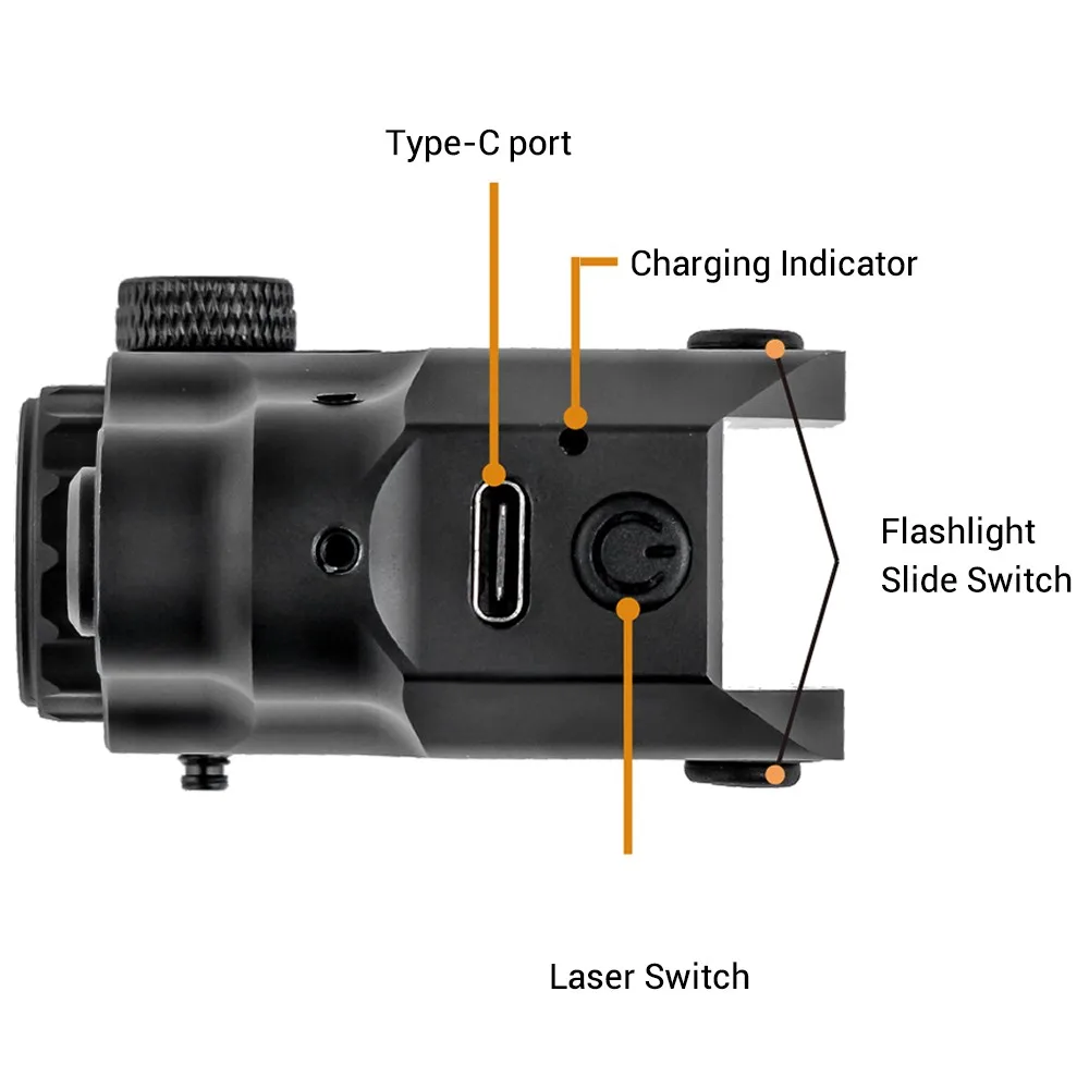 La linterna LED y la mira láser roja/Verde están alimentadas por una batería recargable incorporada, que se carga con un cable de carga tipo C. El láser puede usarse durante 5 horas. La potente duración de la batería le permite no preocuparse por quedarse sin energía.