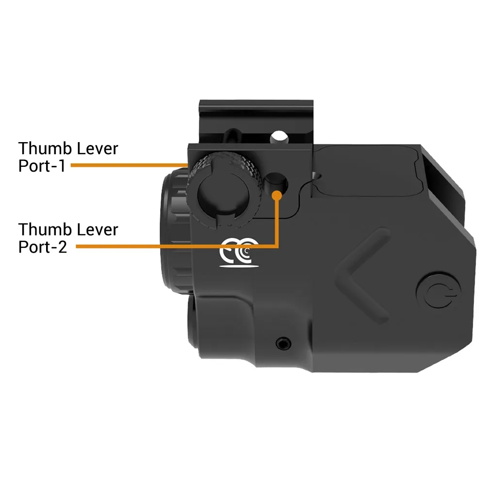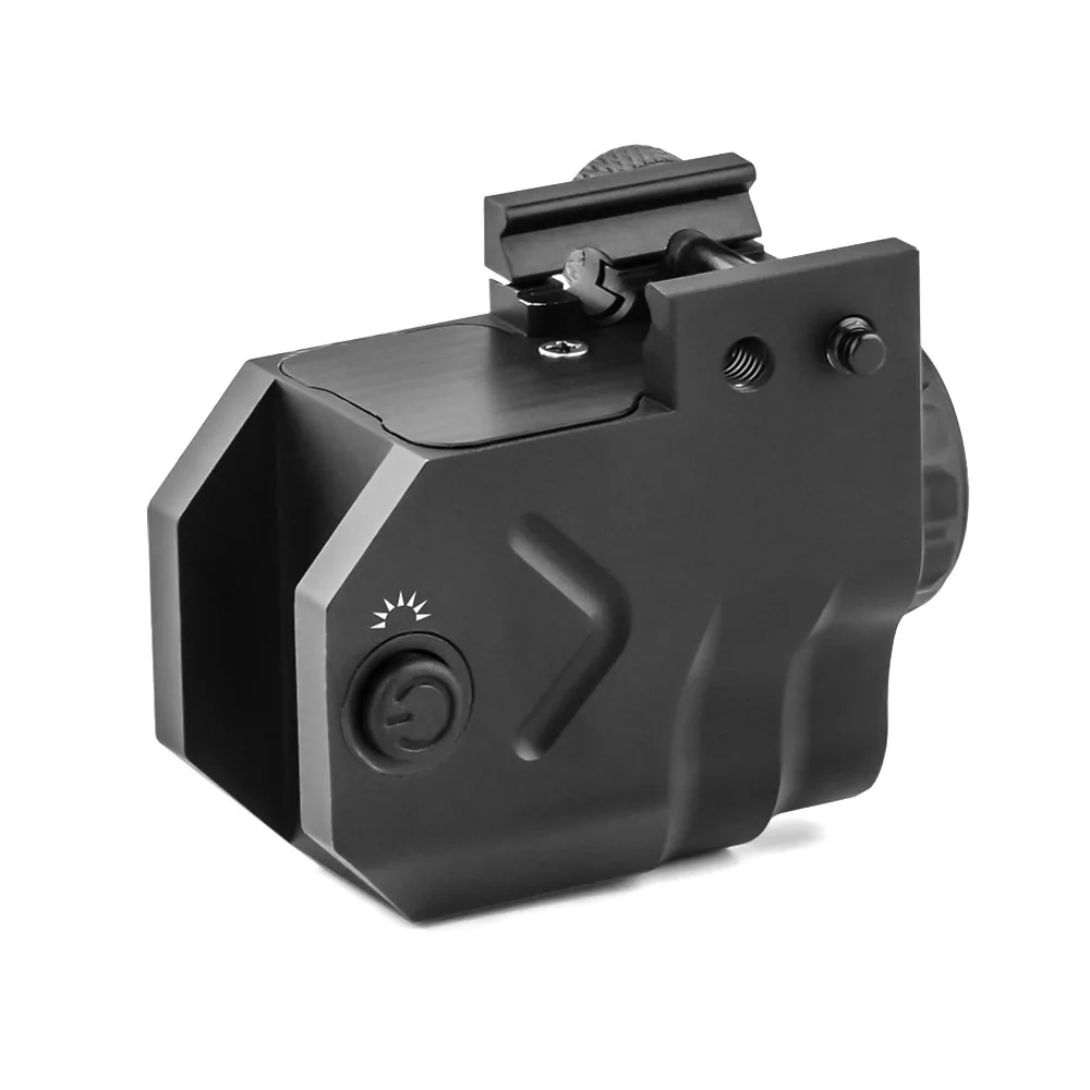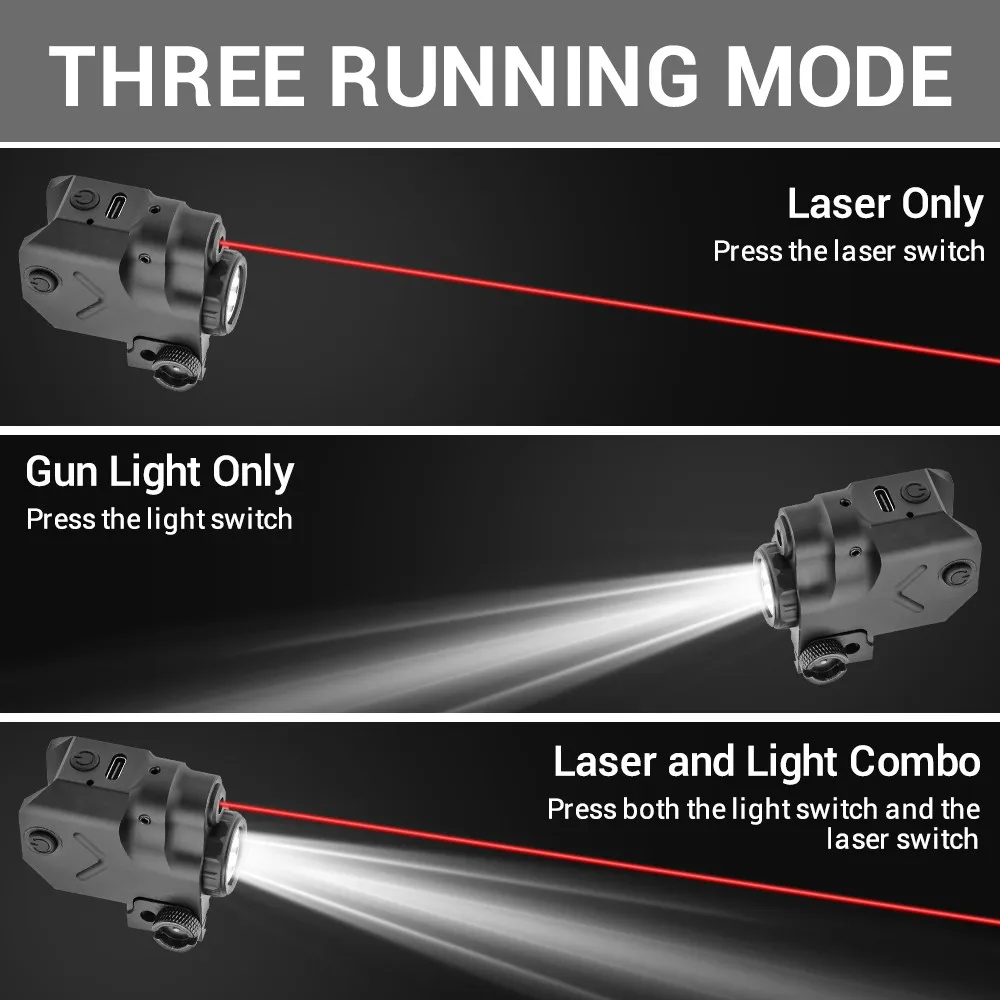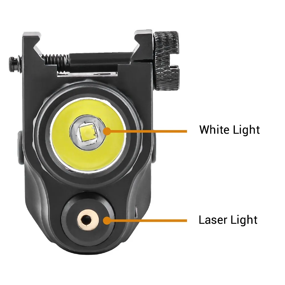 La luz LED y la mira láser se pueden encender o apagar de forma independiente, por lo tanto, puede tener combinaciones de luz y láser, solo luz (modo estroboscópico disponible) y solo láser.