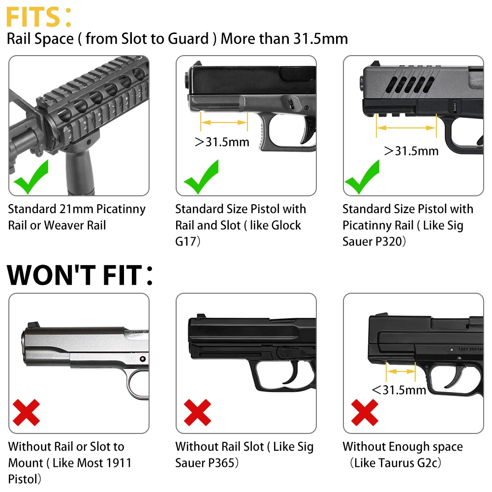 Este combo de MIRA LÁSER Picatinny se puede montar en pistolas como Beretta 92A1, Remington RP9, Ruger P95, S & W SD40Ve, Smith y Wesson M & P 9mm, Armería Springfield 9mm, tauro PT 101. Etc.