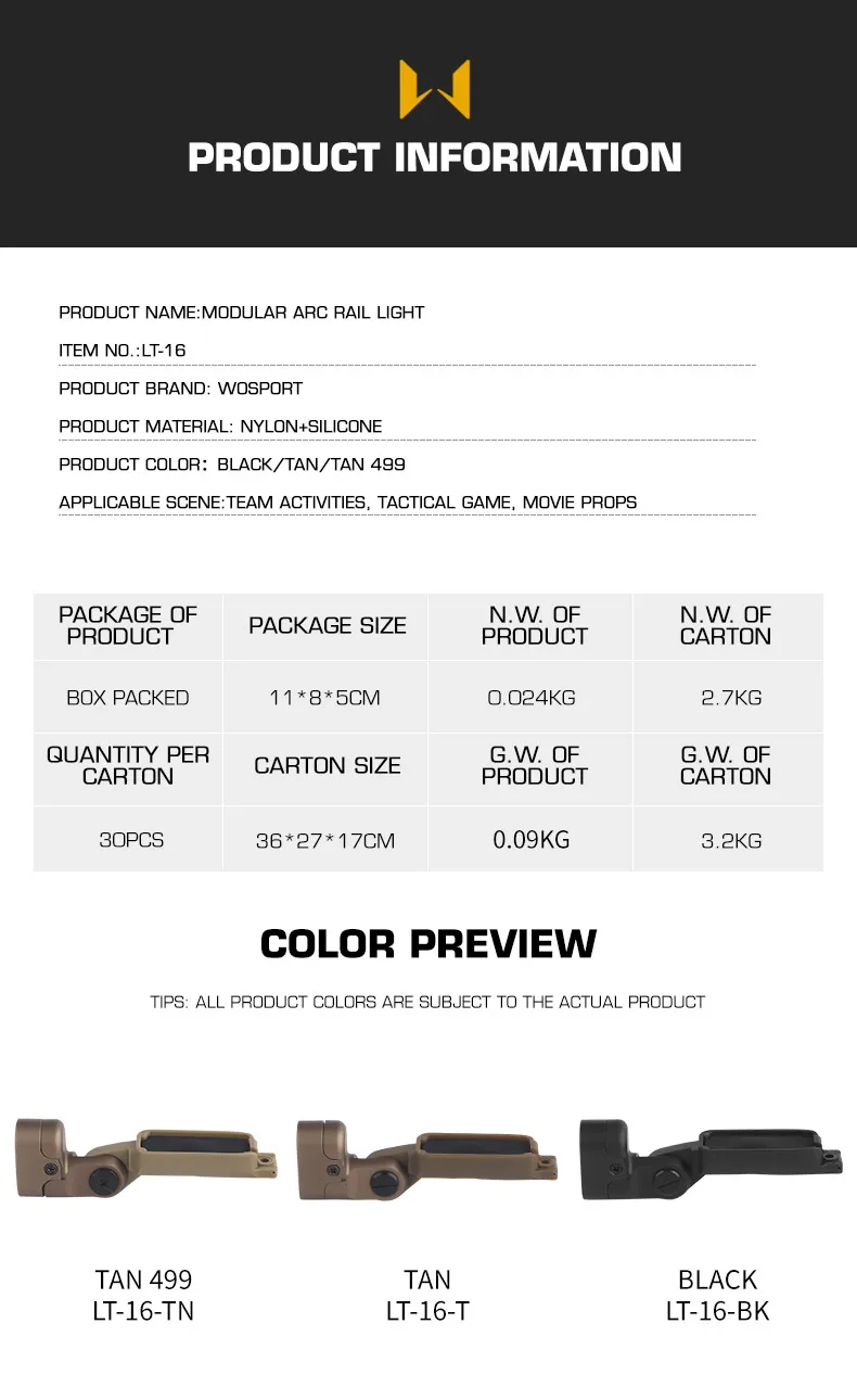Luz de riel ARC modular de control con una sola tecla compatible con rieles ARC modulares (HL-ACC-84)Información del producto Nombre del producto: Luz de riel ARC modular Artículo No.:LT-16 Material del producto: nailon + silicona. Color del productonegro/Tanado/Tan 499 Escena aplicable: actividades de equipo, juegos tácticos, accesorios de película.