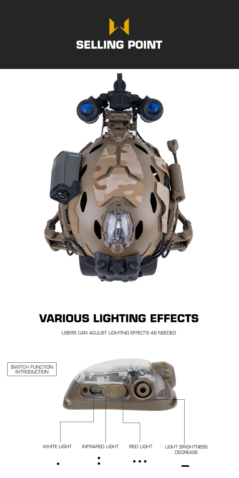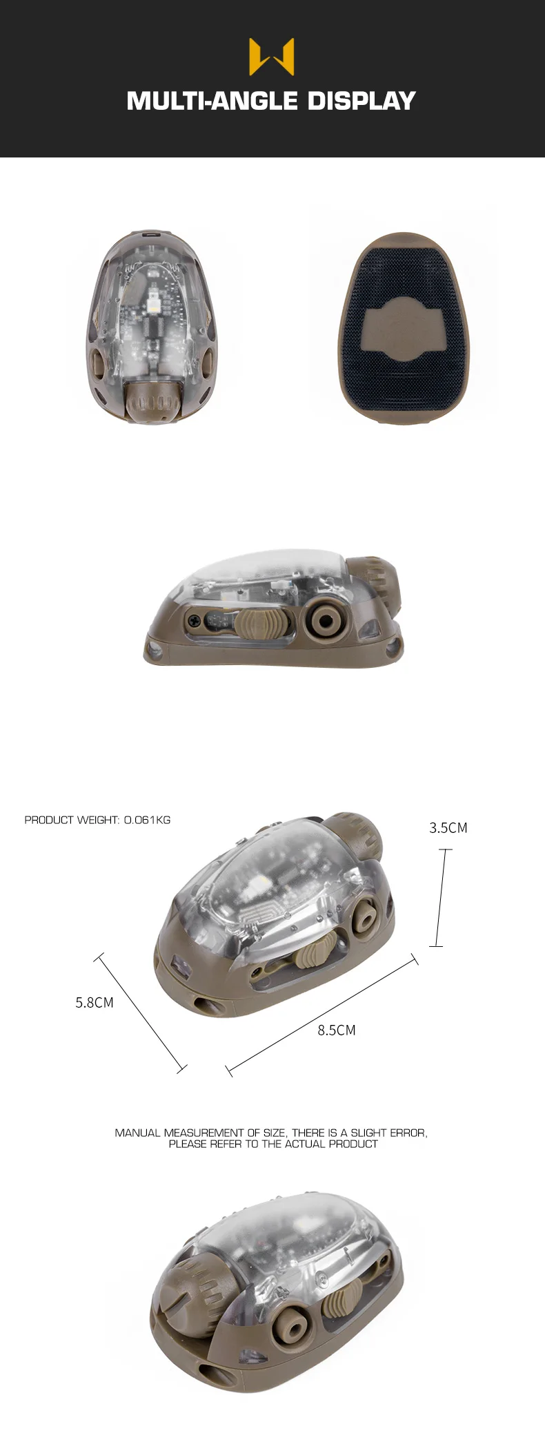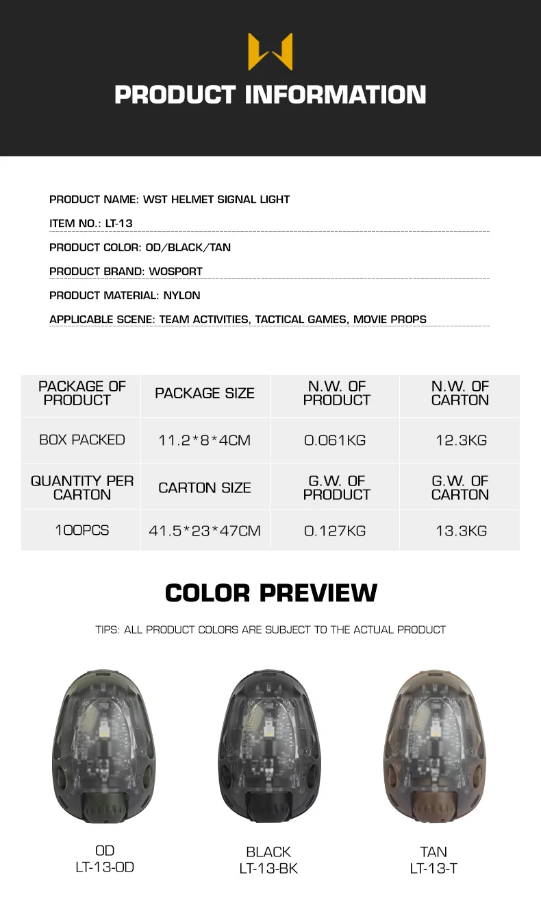 Nombre del producto: Luz de señal para casco WST Artículo No.: LT-13 Color del producto: OD/Negro/Tanado Marca del producto: WOSPORT Material del producto: nailon Escena aplicable: actividades en equipo, juegos tácticos, accesorios de película.