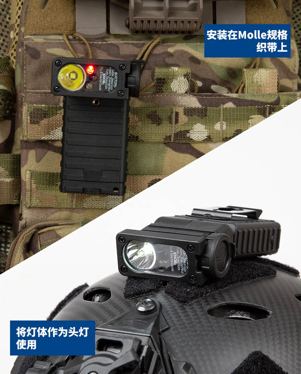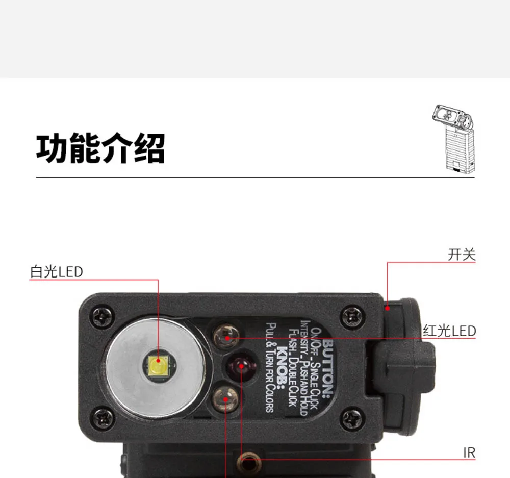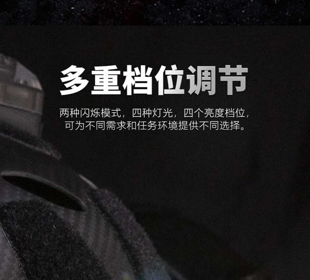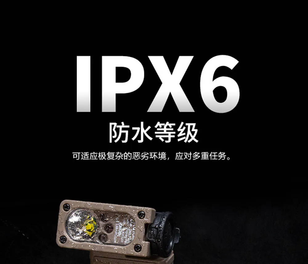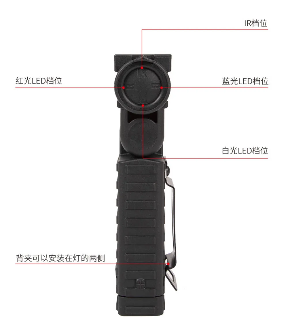 2.Plataforma táctica de cuatro luces: LED blanco: para iluminación diaria y marcado de áreas.LED azul: para operaciones de rescate e identificación de personal (utilización de una penetración de longitud de onda específica).LED rojo: para operaciones secretas en entornos con poca luz.LED infrarrojo IR: para funcionamiento colaborativo con equipos de visión nocturna.Todas las fuentes de luz admiten modos duales de encendido/apagado constante y cuatro niveles de ajuste de brillo, adecuados para todos los escenarios en la jungla, desiertos y de noche.