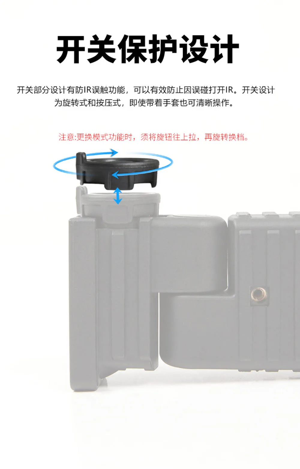 4.Funcionamiento intuitivo: control integrado de doble interruptor (selección de marcha rotativa + interruptor de presión).Interfaz de operación compatible con guantes.Mecanismo de bloqueo por infrarrojos para evitar toques accidentales y evitar pérdidas de energía.