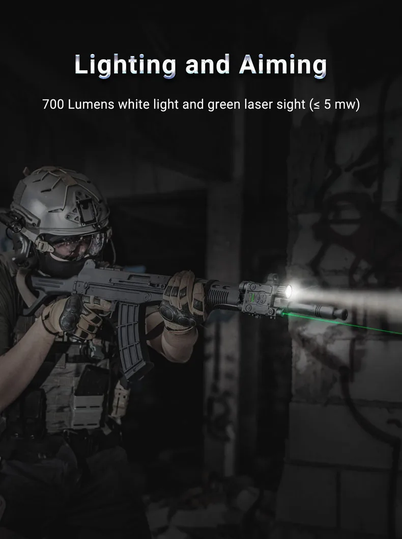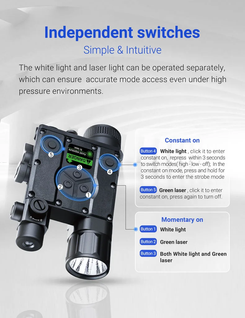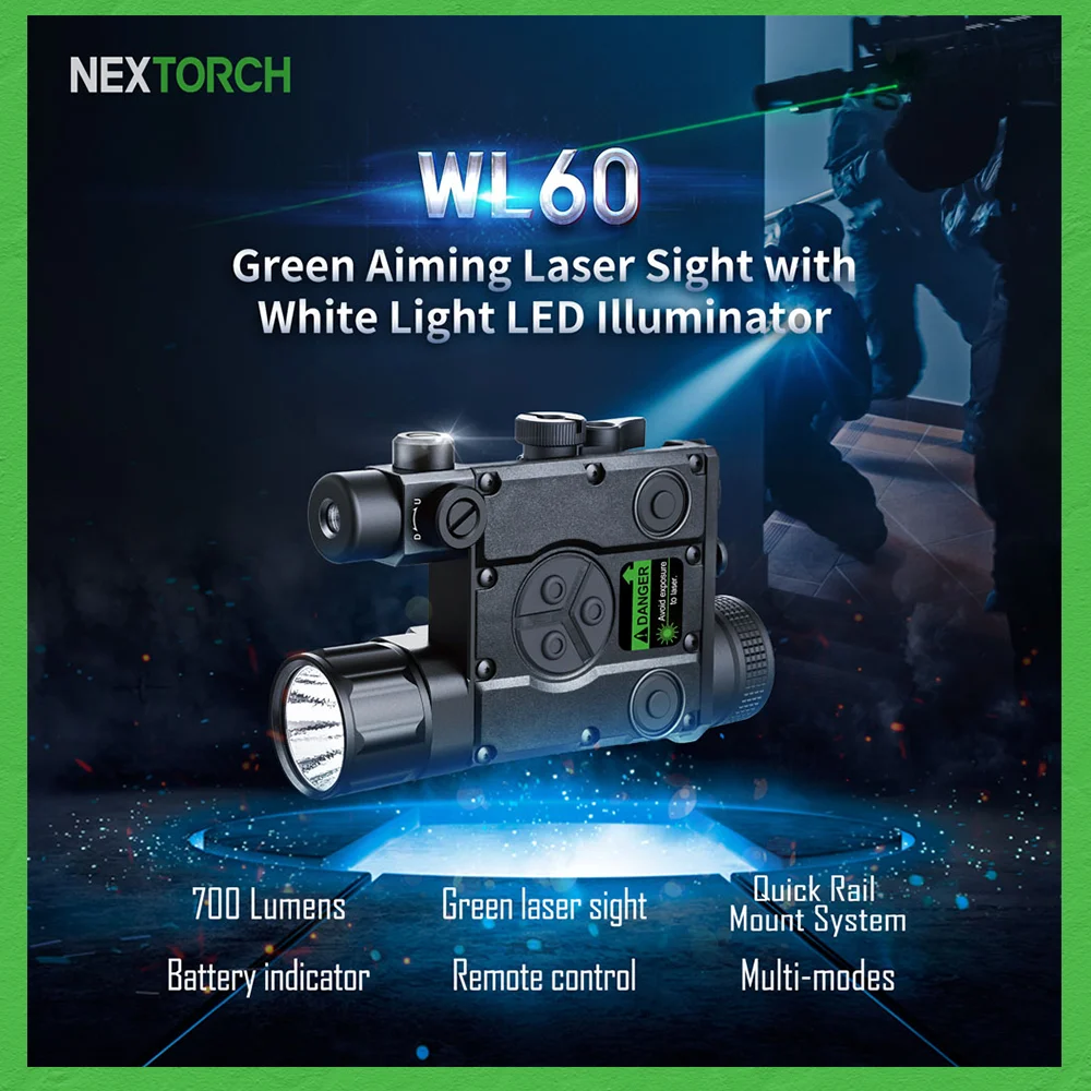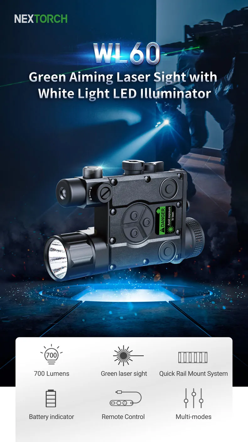 1.WL60 es una iluminación de luz blanca + láser verde dirigida con luz de rifle dos en uno, luz blanca de hasta 700 lúmenes;