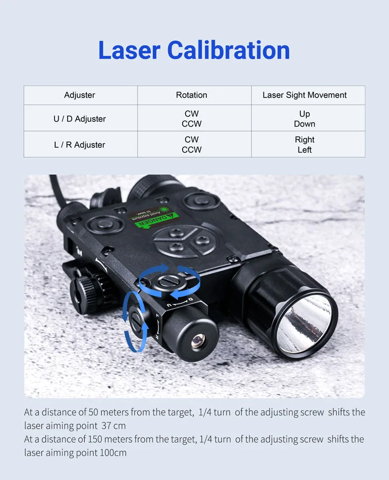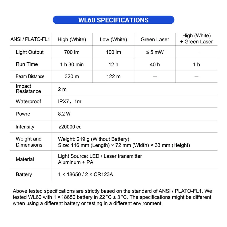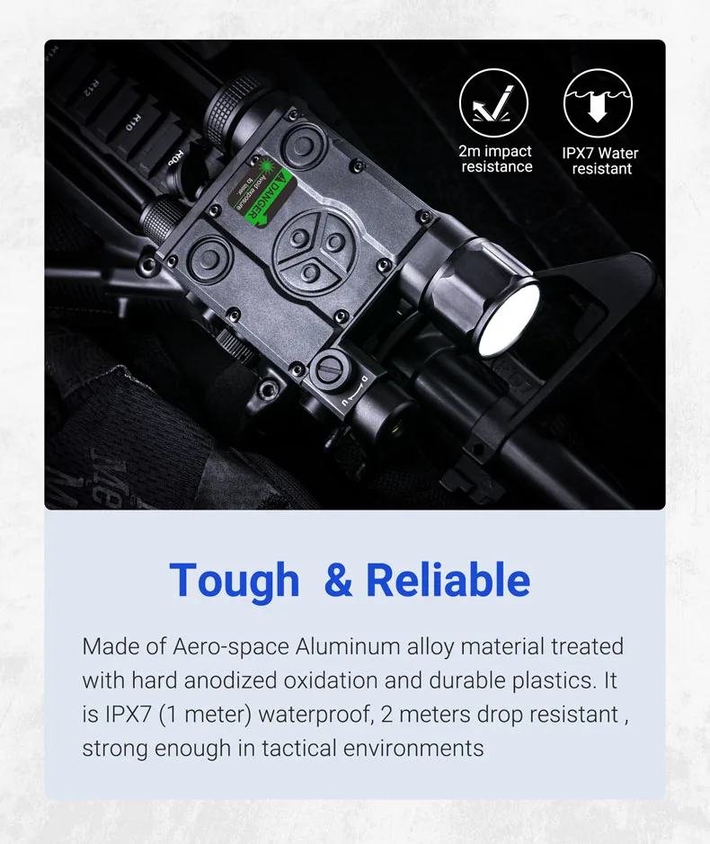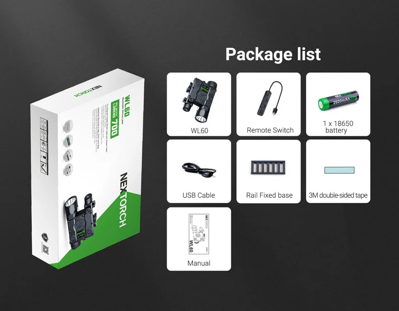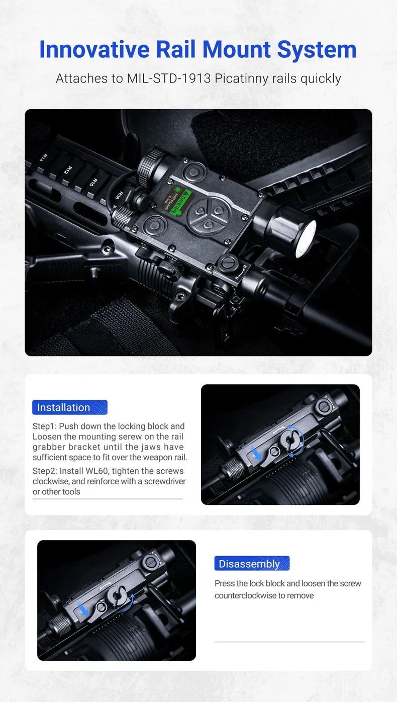 1.WL60 es una iluminación de luz blanca + láser verde dirigida con luz de rifle dos en uno, luz blanca de hasta 700 lúmenes;