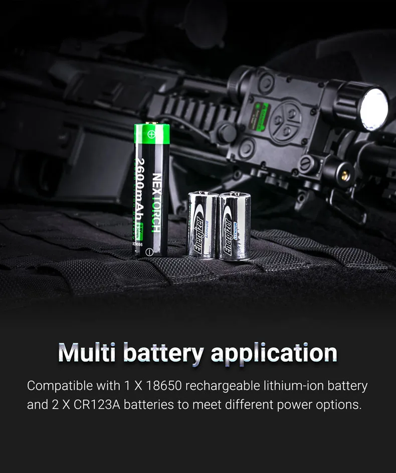 6. Compatible con una batería recargable de iones de litio 18650 y dos baterías CR123A de baja temperatura, para satisfacer las necesidades de energía de diferentes entornos.