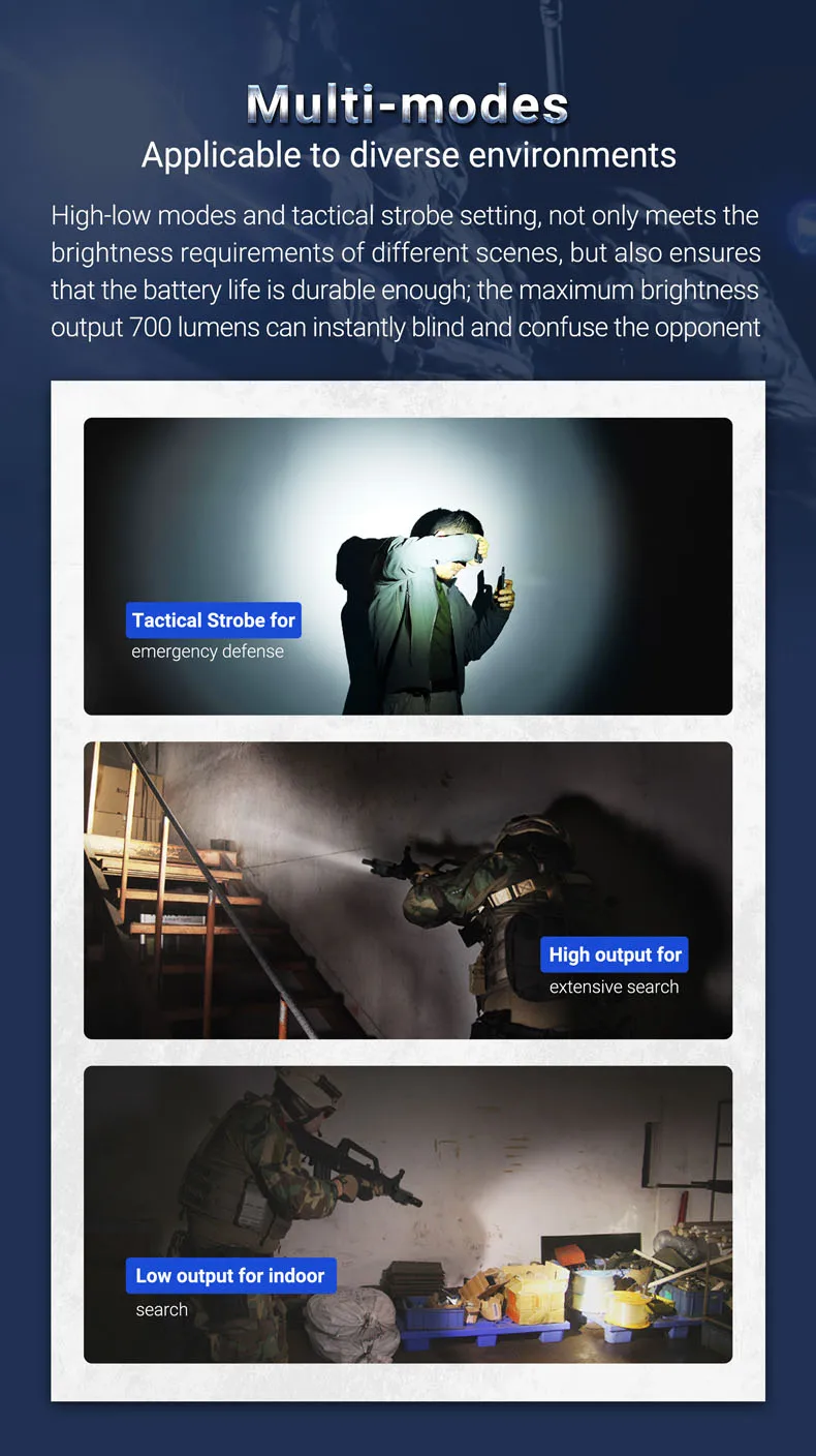3.Configuraciones de flash táctico + de doble velocidad alta y baja, adecuadas para diversos entornos;
