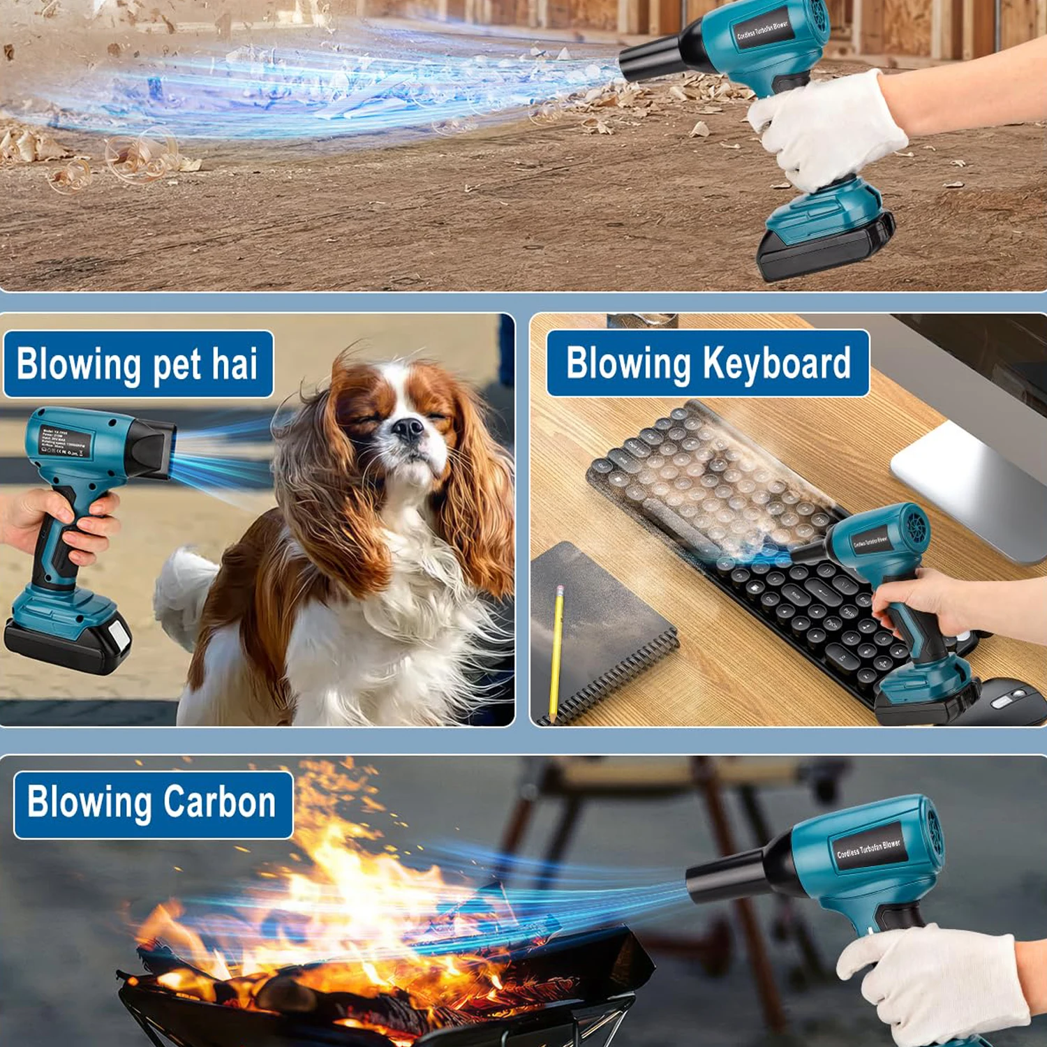 【Amplia gama de usos】Es una herramienta de limpieza multifuncional para el hogar, el automóvil y la oficina, adecuada para soplar carbón, soplar polvo industrial, soplar polvo, limpiar teclados, limpiar automóviles y motocicletas, limpiar consolas centrales de automóviles, limpiar grietas de automóviles, limpiar pies, etc..