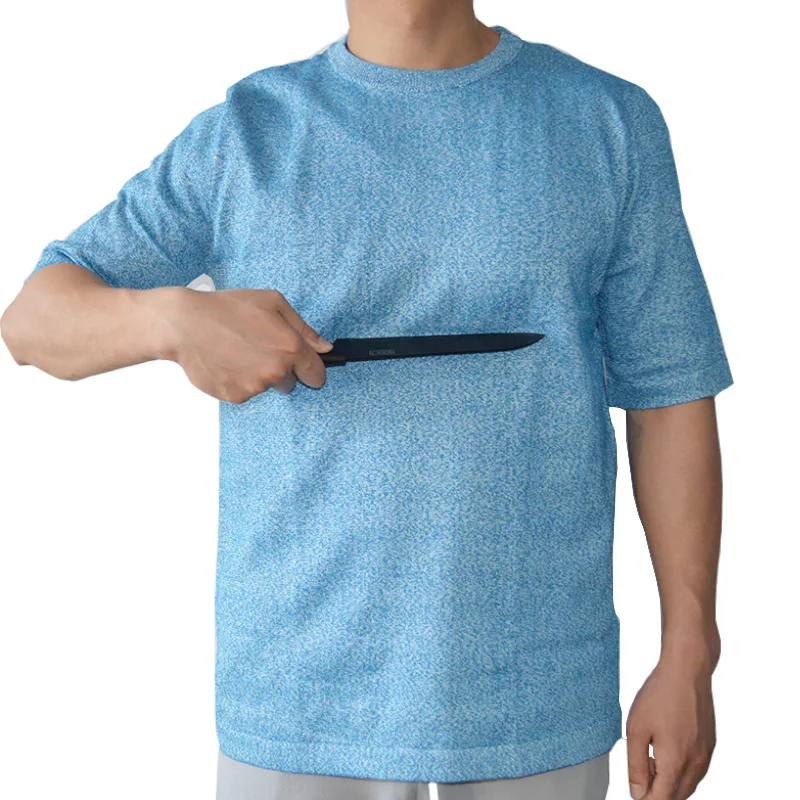 Las fibras de Saintfabric® están dispuestas aleatoriamente y entrelazadas para formar una estructura de red apretada e irregular, y luego las capas de la estructura de la red se superponen, por lo que el La punta de un cuchillo está unida y bloqueada por las capas de fibra durante el proceso de penetración, sin poder empujar todos los filamentos para penetrar suavemente en el cuerpo del usuario.