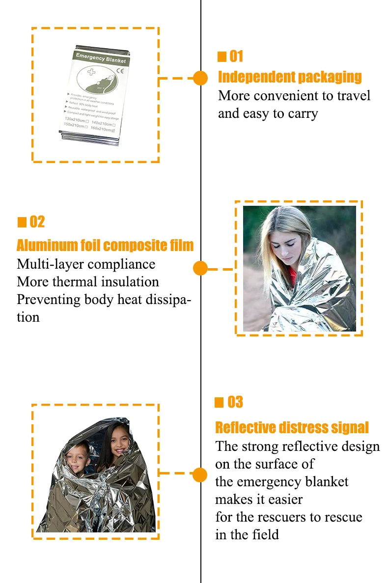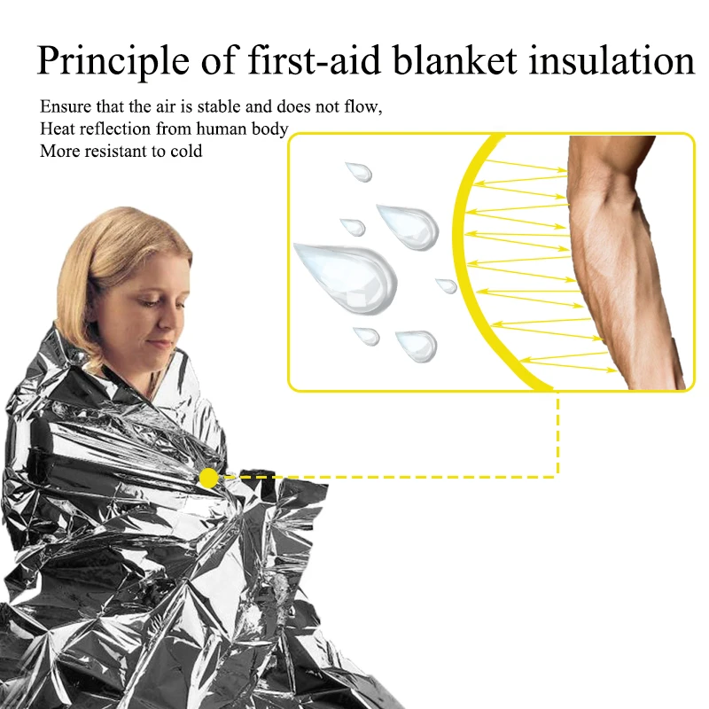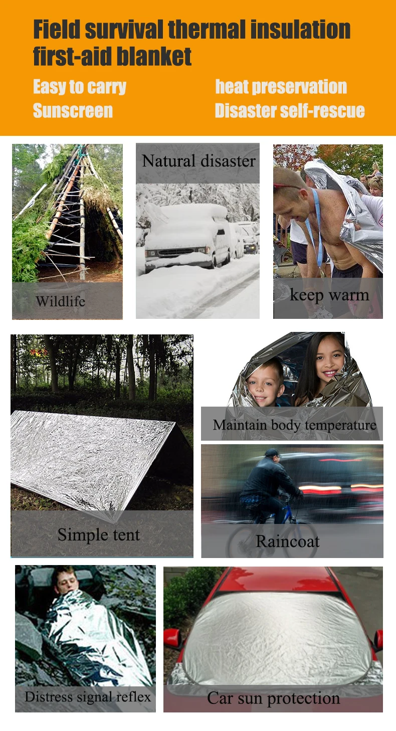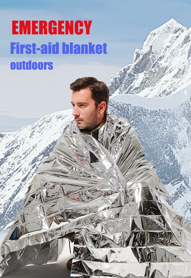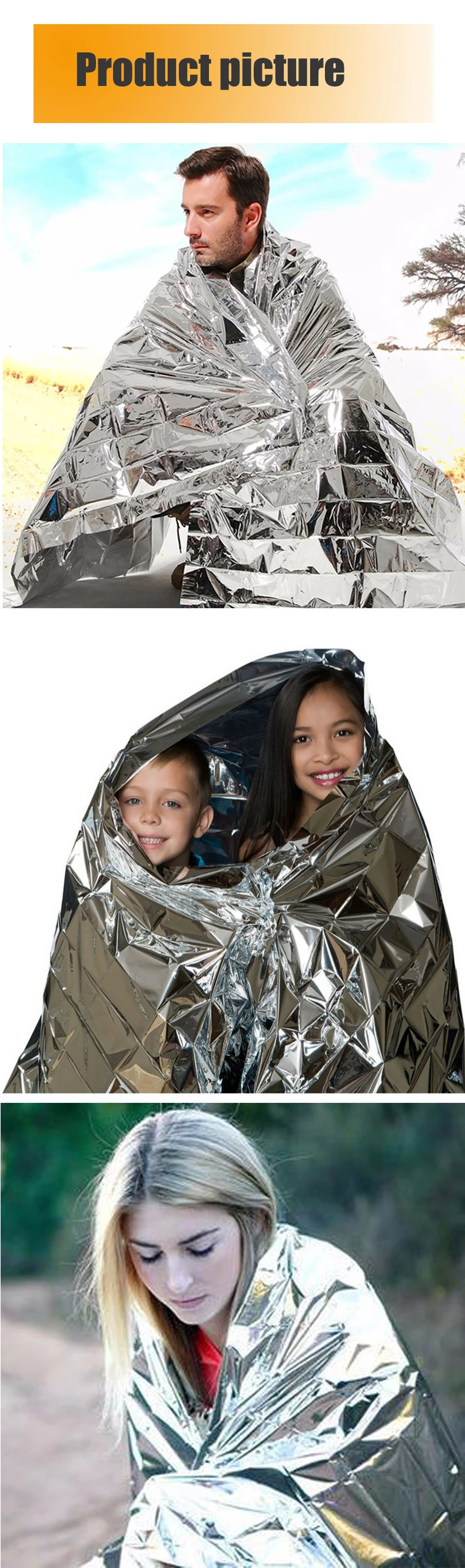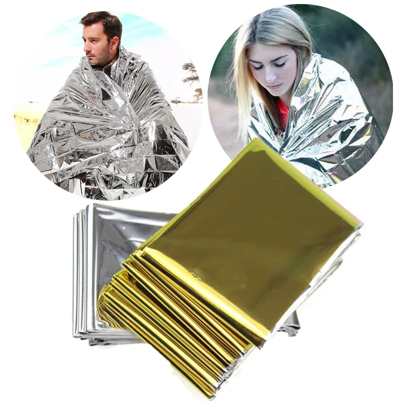 Manta de emergencia para exteriores, herramienta de supervivencia, primeros auxilios, aislamiento térmico a prueba de viento, protección solar, resistente al desgarro, manta de senderismo