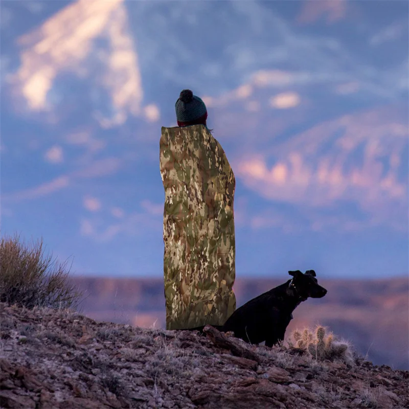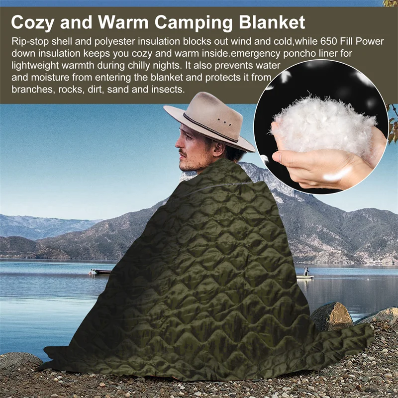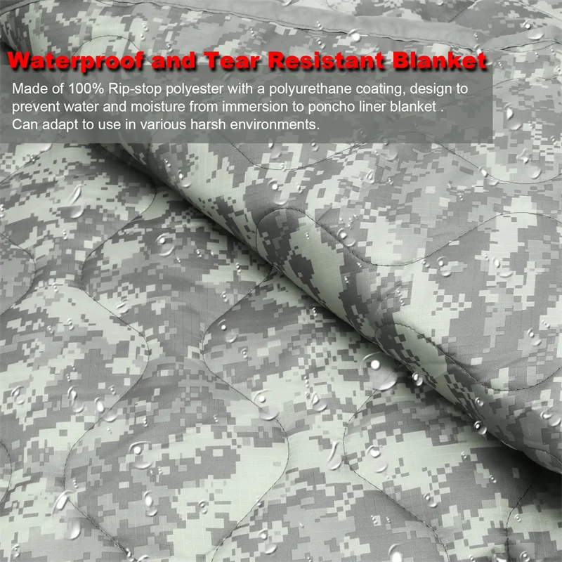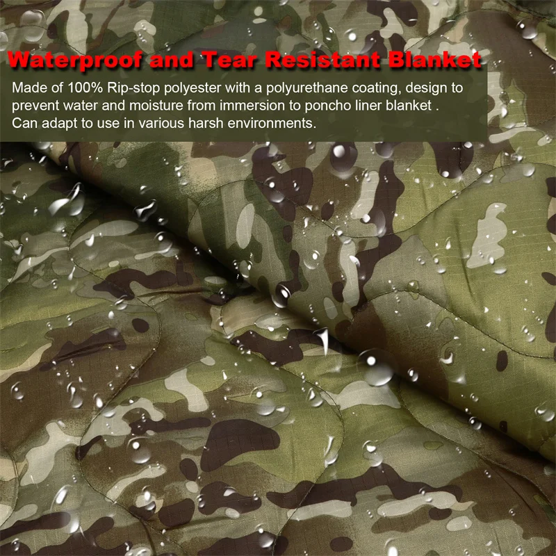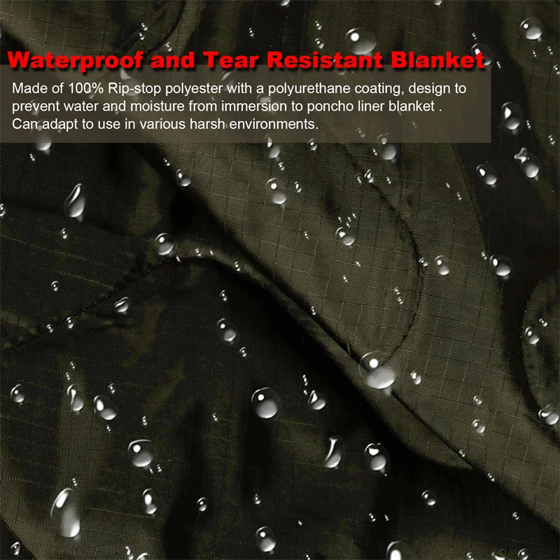 Manta impermeable y resistente al desgarro: hecha de 100% poliéster antidesgarros con un revestimiento de poliuretano, diseño para evitar que el agua y la humedad se sumerjan en la manta con forro tipo poncho. Puede adaptarse para su uso en diversos entornos hostiles.