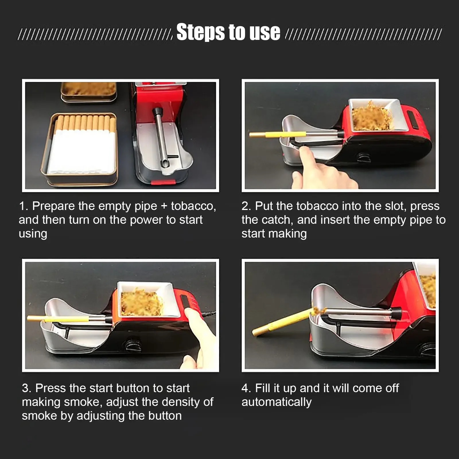 Función: Coloque la pipa vacía y el tabaco triturado, presione el interruptor y un cigarrillo saldrá automáticamente, lo cual es conveniente y rápido.