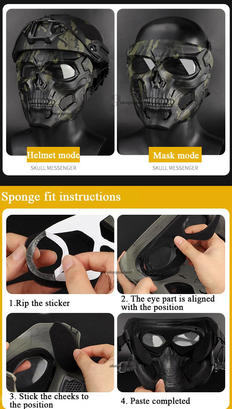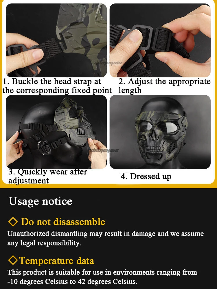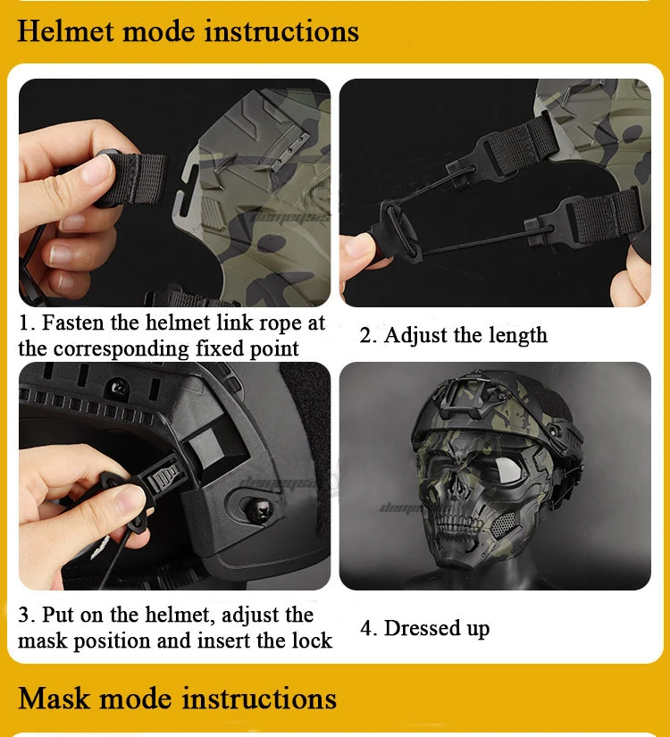 ● Máscara única de doble uso. 1. Modo de uso de la diadema elástica, 2. Conectado al casco táctico a través de accesorios