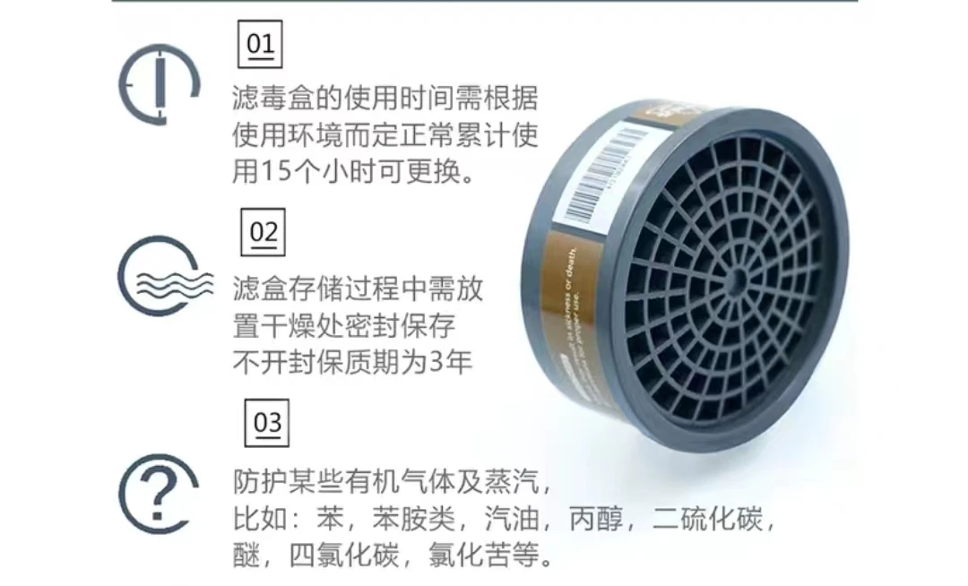 Nota:1. No utilice este conjunto en las siguientes situaciones:1) El ambiente donde la concentración de oxígeno es inferior al 19.5%;2) Entornos con naturaleza desconocida de ambiente dañino.2.Cuando sienta un aumento significativo de la resistencia respiratoria o síntomas incómodos como olor peculiar, tos, irritación, náuseas, etc. durante el uso, debe abandonar el entorno dañino inmediatamente y revisar el traje, confirme y elimine la falla antes de volver a usarla y entrar en el entorno dañino; No existe falla, Elemento filtrante efectivo debe ser reemplazado:1) Hay rejillas de ventilación en los lados superior e inferior del Marco de las gafas. Se debe garantizar una buena permeabilidad al aire para reducir la humedad en las gafas y hacer que su uso sea más cómodo.