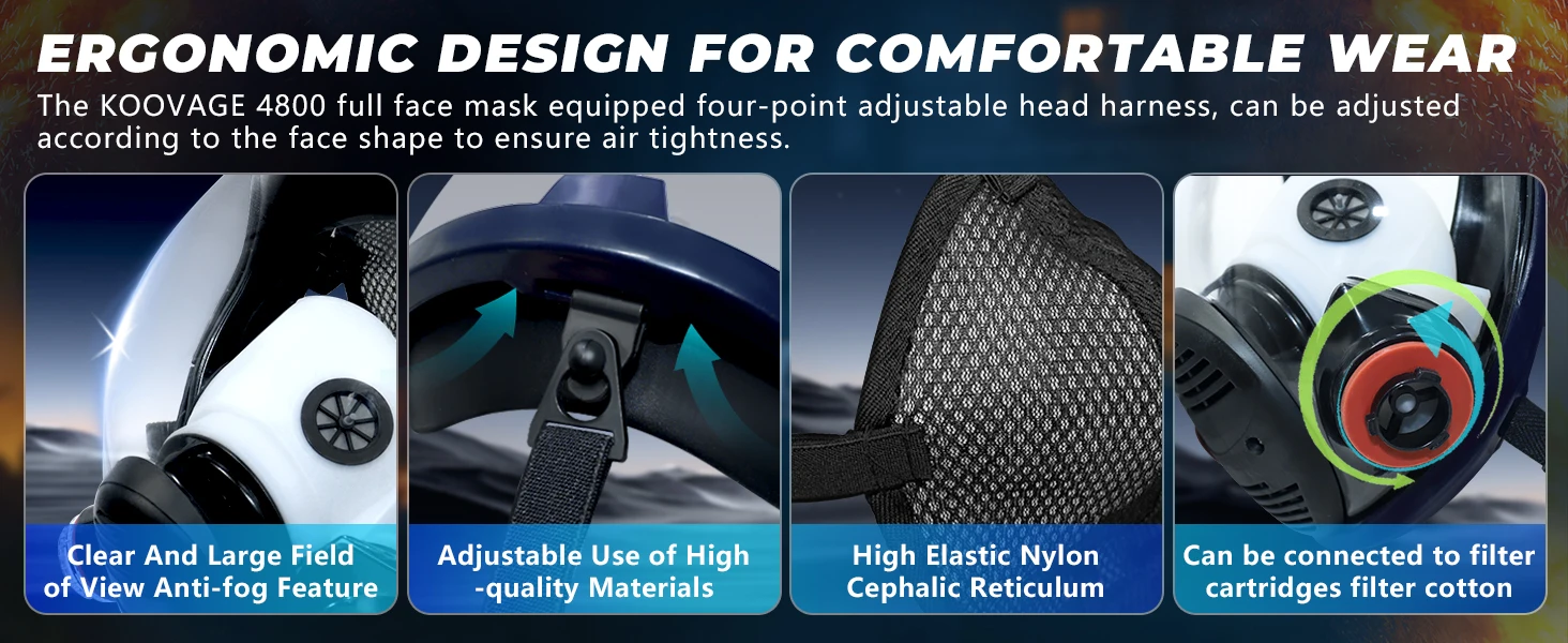Diseño ergonómico, cómodo de llevar: la mascarilla facial completa está equipada con una diadema ajustable de cuatro puntos que se puede ajustar según la forma de la cara para garantizar la hermeticidad.【Precauciones】 Use una mascarilla facial completa y no use gafas.Después de su uso, se requiere una prueba de sellado.El borde de sellado de la máscara antigás es muy parecido a la cara, con una textura suave y cómoda de llevar.La máscara antigás es cómoda de llevar y fácil de transportar.