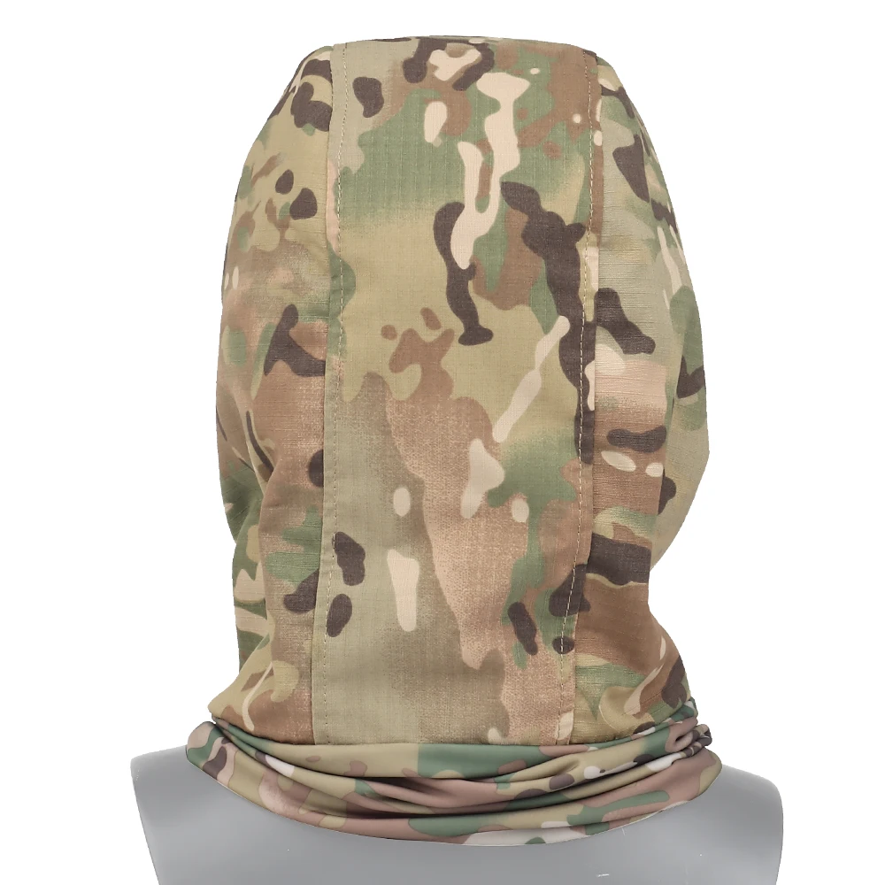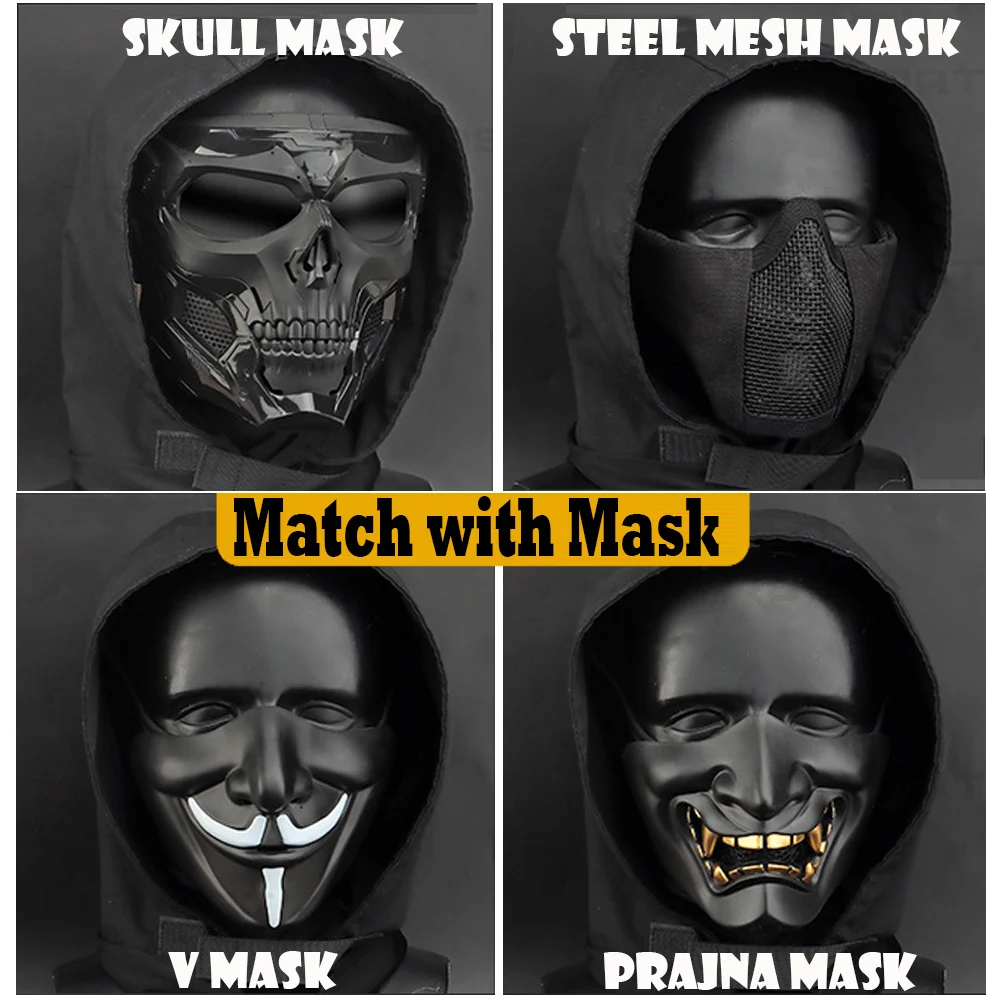 Características:La capucha está hecha de tela escocesa y tela elástica. Tiene las características de alta elasticidad, alta resistencia al desgaste y transpirabilidad. Se puede usar con varias máscaras tácticas y máscaras de Halloween, o se puede usar solo.