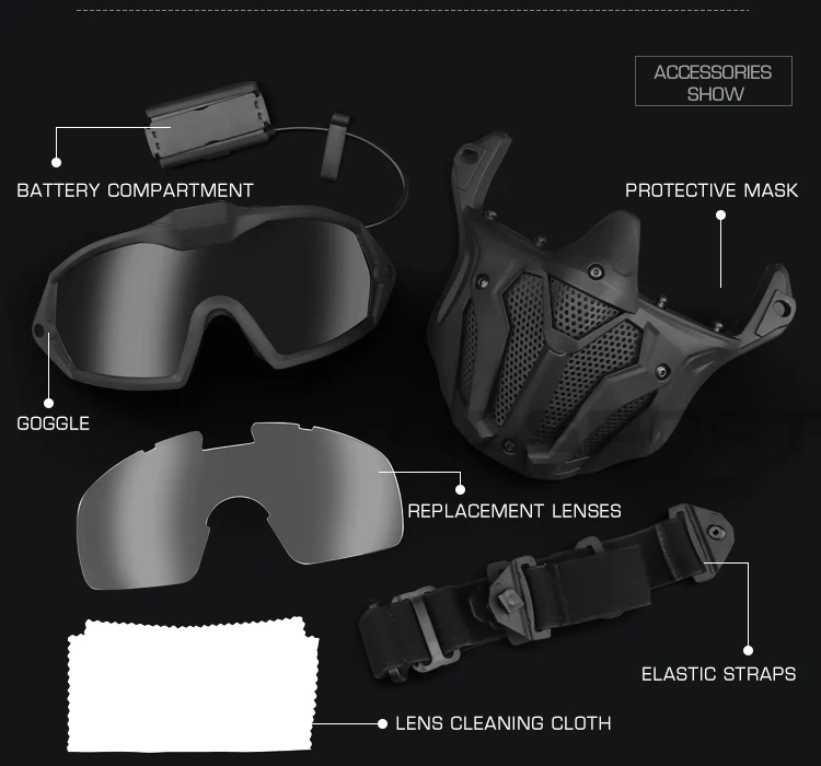 -- Accesorios: máscara, gafas, tela para gafas, lentes de repuesto, correas elásticas