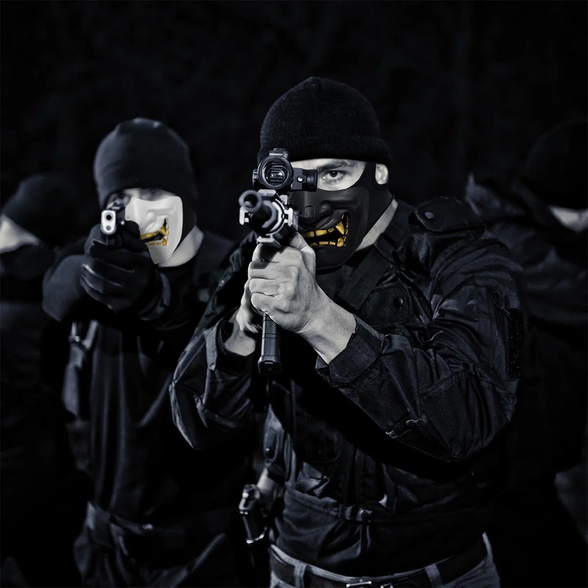Máscara resistente a impactos: En condiciones normales de temperatura, resistencia a impactos de 800 FPS, que cumple con los requisitos de los productos de protección táctica al aire libre. Proteja la parte inferior de la cara, los dientes y la nariz contra perdigones de 800 pies por segundo/pistola BB.