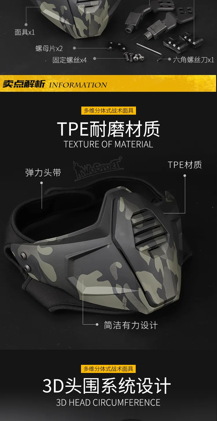 Esta máscara táctica multidimensional de estilo dividido está hecha de material TPE resistente al desgaste y es un equipo práctico para guerra al aire libre, CS para personas reales y accesorios de películas.Ofrece múltiples opciones de color como negro, verde, barro, gris y camuflaje.