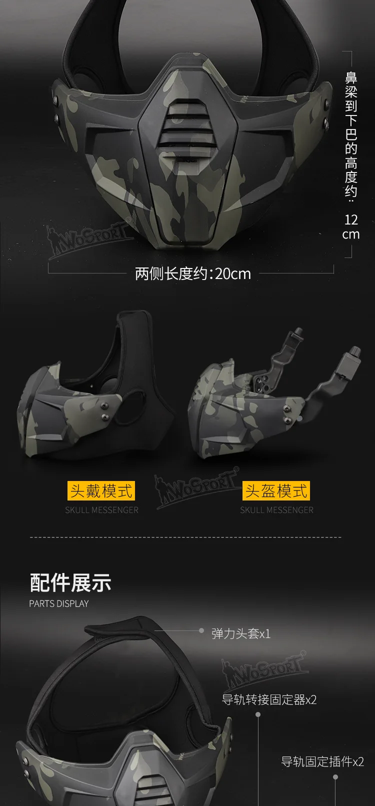 Compatibilidad de modo dual: admite "modo montado en la cabeza" (cocar elástico + ajuste de cinta mágica) y "modo casco" (a través del adaptador de riel guía para fijar el casco táctico), lo que permite cambiar de escena libremente;