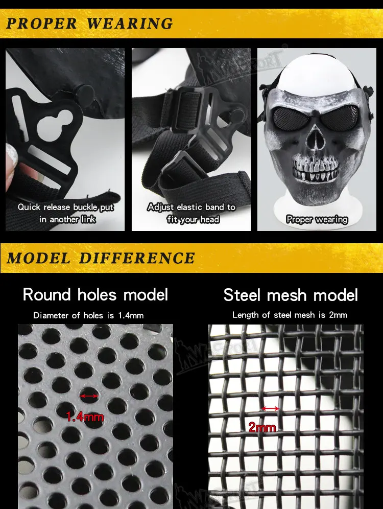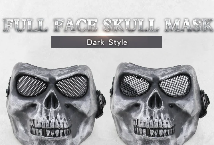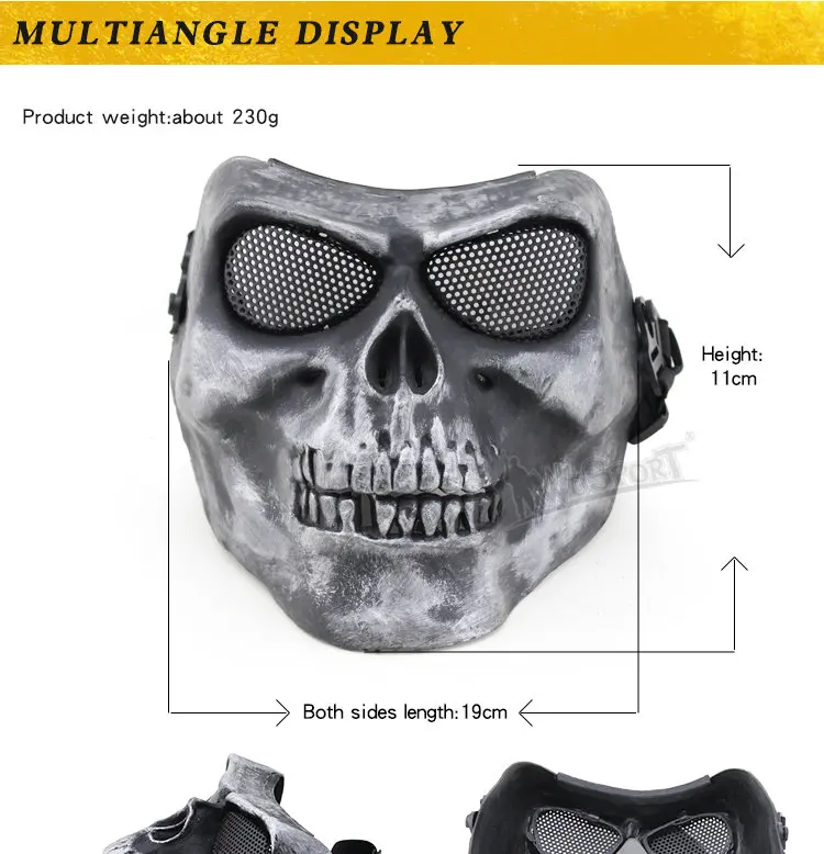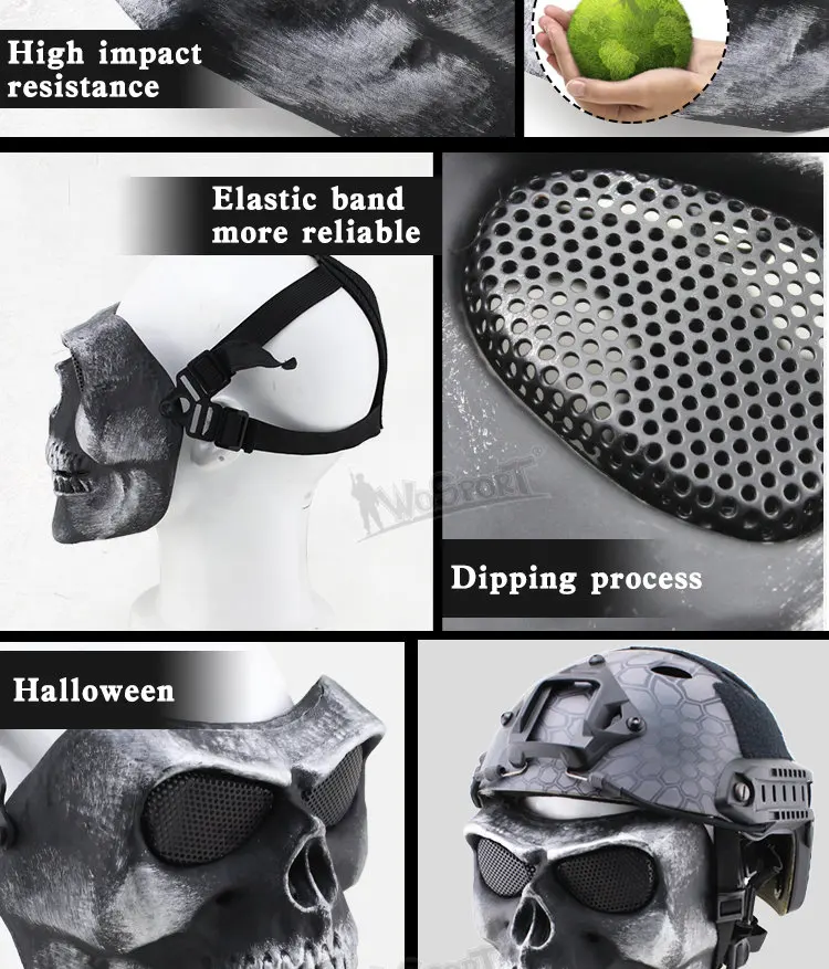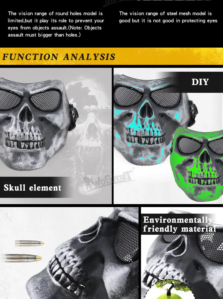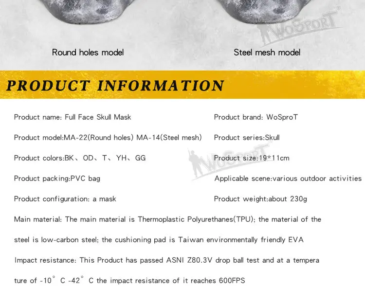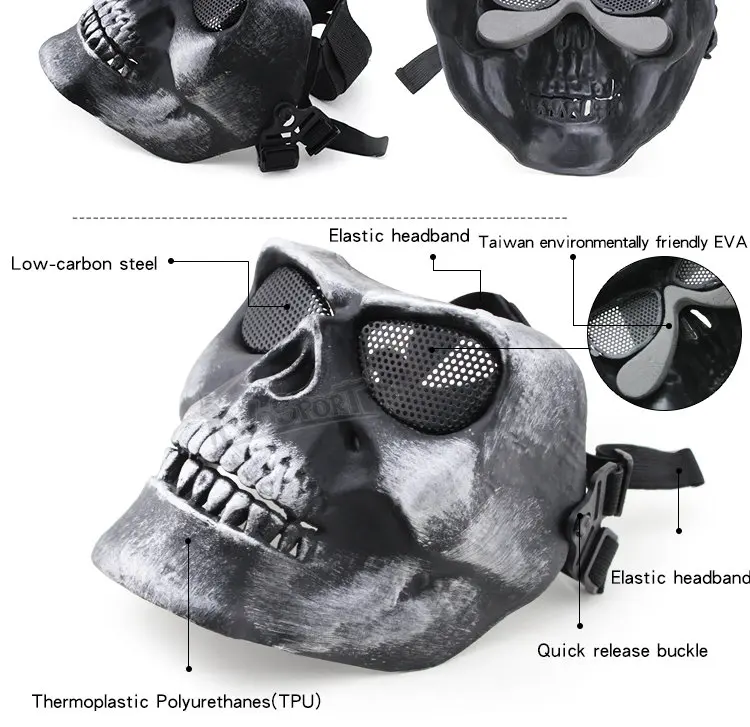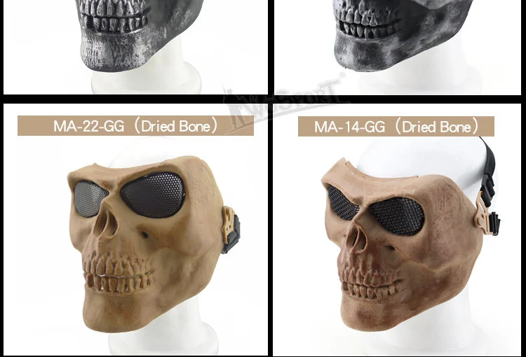 -- Nombre del producto: máscara de cráneo de cara completa -- Artículo No.: MA-14 -- Tamaño del producto: 19*11cm -- Peso bruto del producto: 0,25 KG -- Resistencia al impacto: 600FPS -- Circunferencia de la cabeza adecuada: 52 · 62cm -- Material principal: TPU, Red de acero para Protección Ambiental verde, acero bajo en carbono, cojín para Protección Ambiental de Taiwán EVA