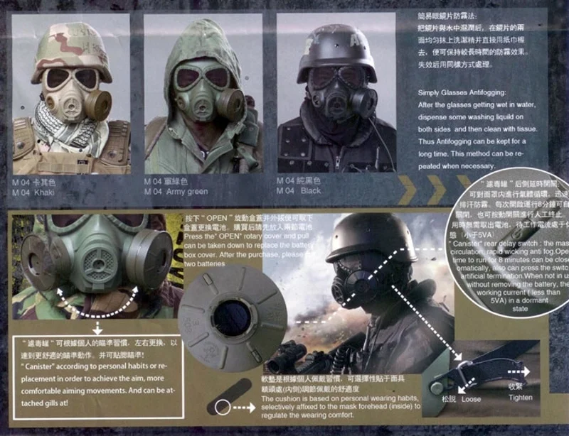 Nota: La máscara de gas modelo M04 se utiliza generalmente en situaciones nucleares y de guerra biológica. Esta es una máscara de gas ficticia que no funciona y no lo protege de gases nocivos, virus o radiación nuclear, es puramente para uso recreativo.