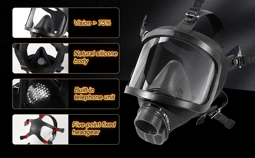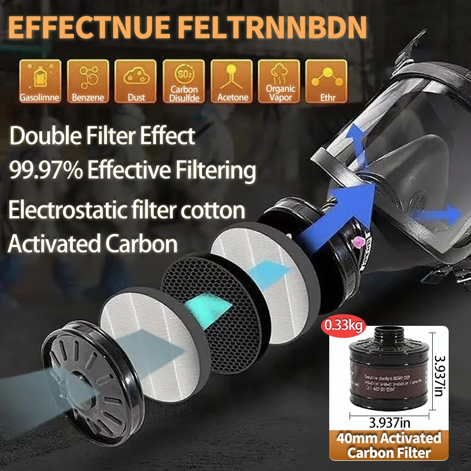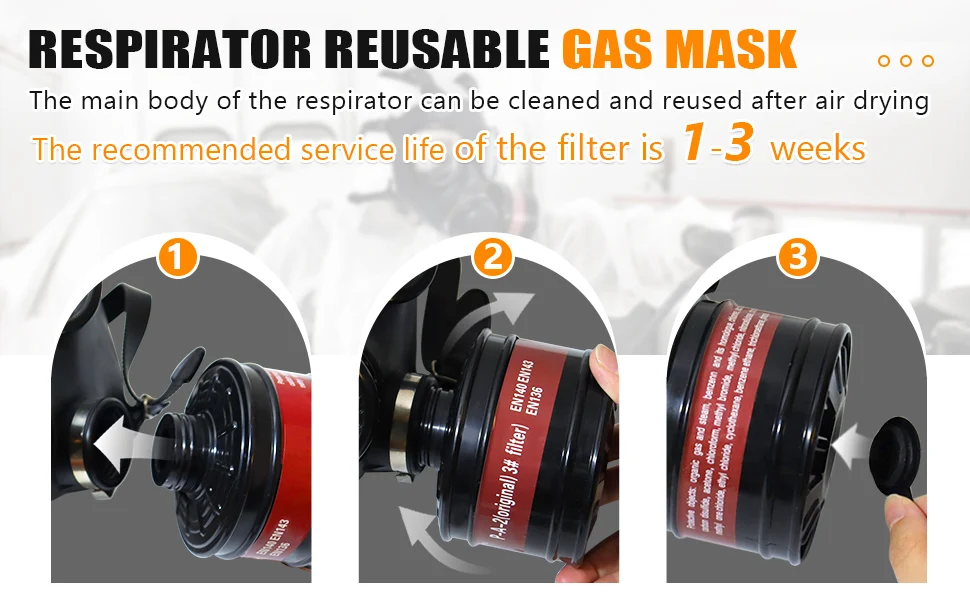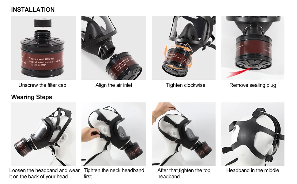 - Instálelo correctamente en la máscara antigás antes de usarla, asegurando un sellado hermético entre la máscara y la cara (sin fugas de aire).Verifique si hay fugas sujetando el aliento y presionando la mascarilla.