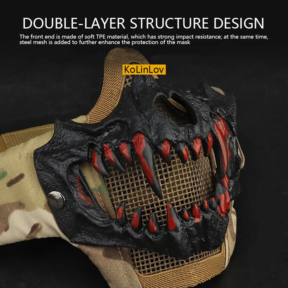 El diseño de colmillos de vampiro añade un elemento intimidante y estético perfecto para Halloween y eventos de terror. Esta característica visual única combina funcionalidad táctica con estilo impactante.