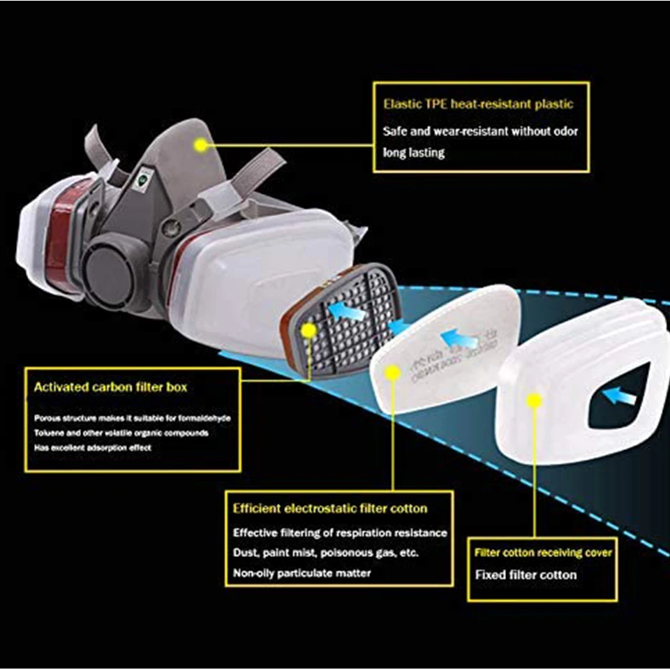 Media máscara 6200-Tamaño medianoProporciona un ajuste cómodo para cualquier tipo y tamaño.El sistema de sujeción de dos correas elásticas de goma en el algodón y la diadema se regula en cuatro puntos.El diseño conveniente proporciona una buena visión general y compatibilidad con protección ocular y gafas para la cabeza y cascos.Paquete Iist2 x caja filtrante, 2 ","