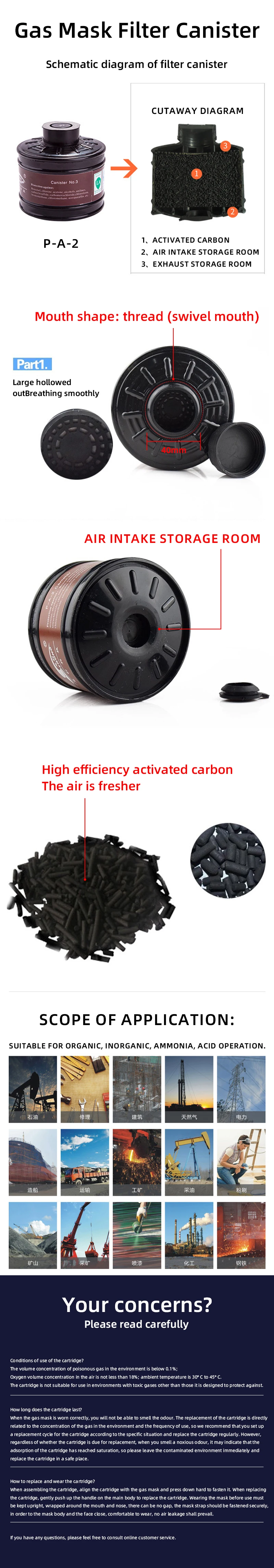 Al ensamblar el cartucho, alinee el cartucho con la máscara de gas y presione con fuerza para sujetarlo. Al reemplazar el cartucho, empuje suavemente hacia arriba el mango en el cuerpo principal para reemplazar el cartucho. El uso de la máscara antes de su uso debe mantenerse en posición vertical, envuelto alrededor de la boca y la nariz, no puede haber espacio, la correa de la máscara debe estar bien sujeta, para que el cuerpo de la máscara y la cara se cierren, sean cómodos de usar, no prevalecerá ninguna fuga de aire.