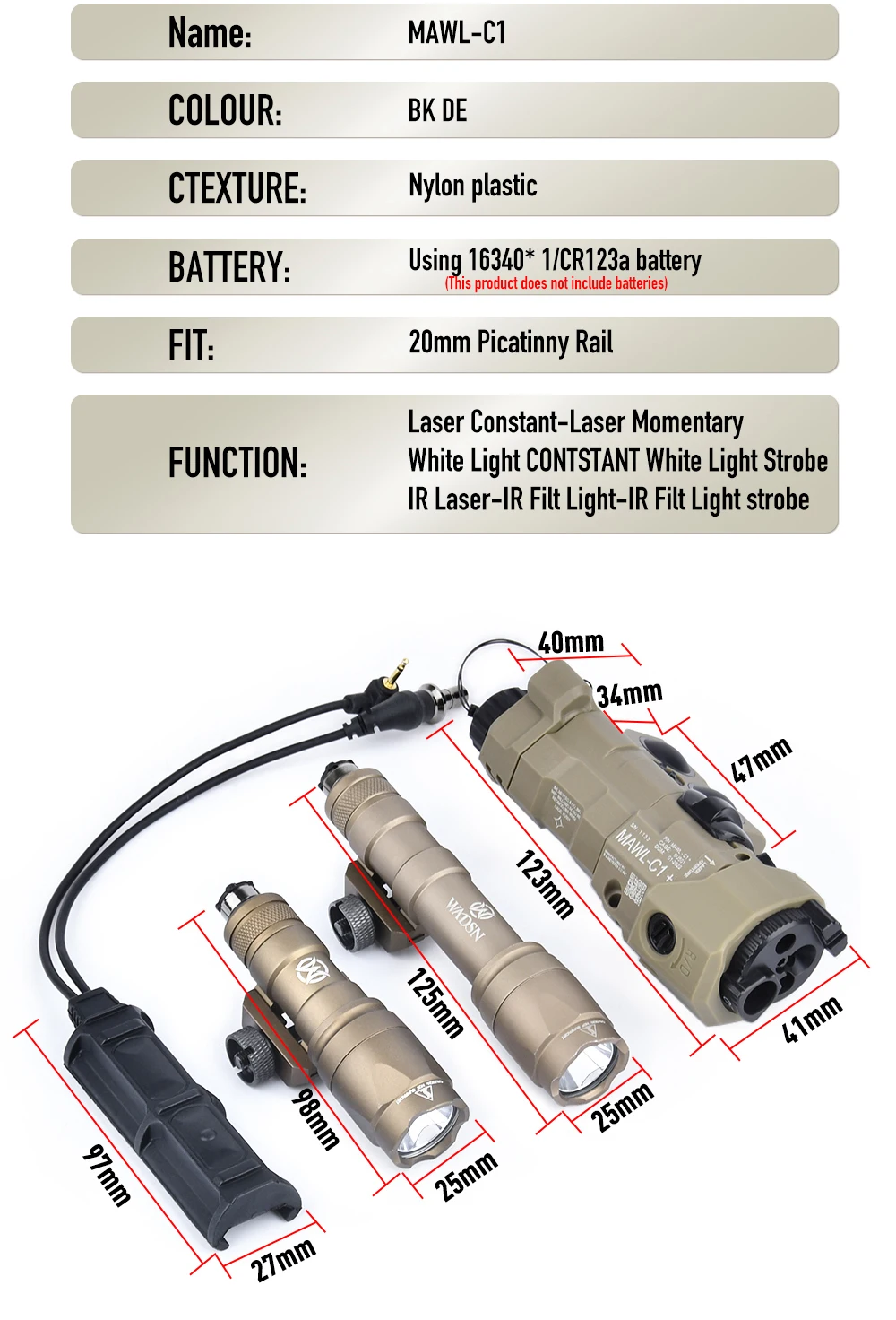 MAWL-C1 táctico rojo verde azul IR punto láser puntería IR luz de relleno Surefir M300A linterna LED blanca interruptor de presión dual remoto