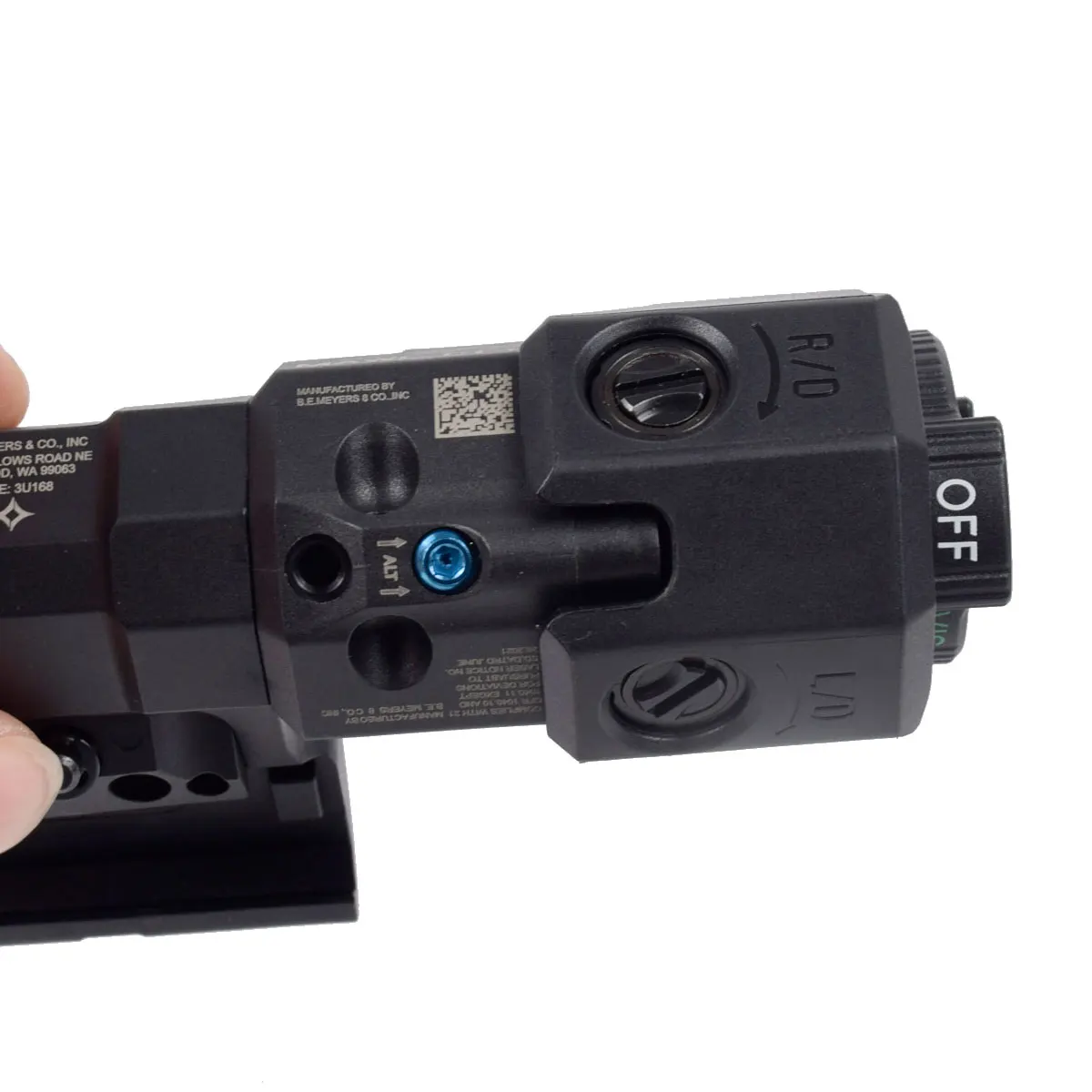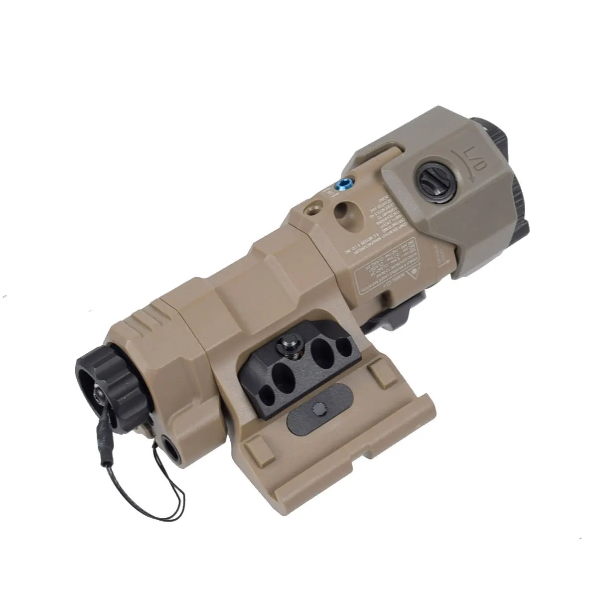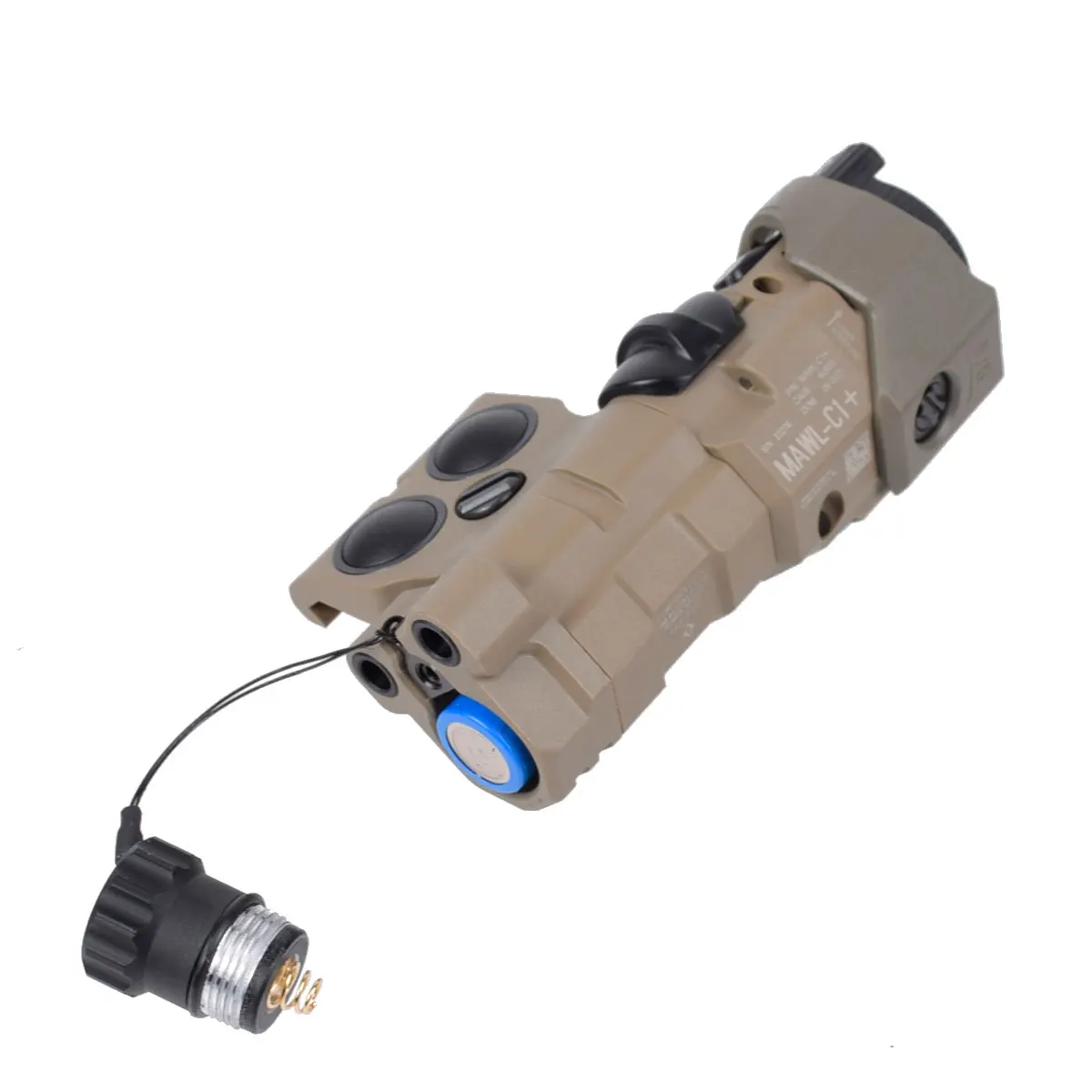 The MAWL head has two embedded LEDs visible only to the shooter. There are two, so when positioning for a left-handed or right-handed shooter, at least one can be seen. When MAWL is switched to VIS or IR, they will emit yellow light. This lets you know that the device is turned on. When you press the A or B button, the LED will light up in green. This is especially useful when you are in IR mode, because you cannot see the beam with the naked eye.