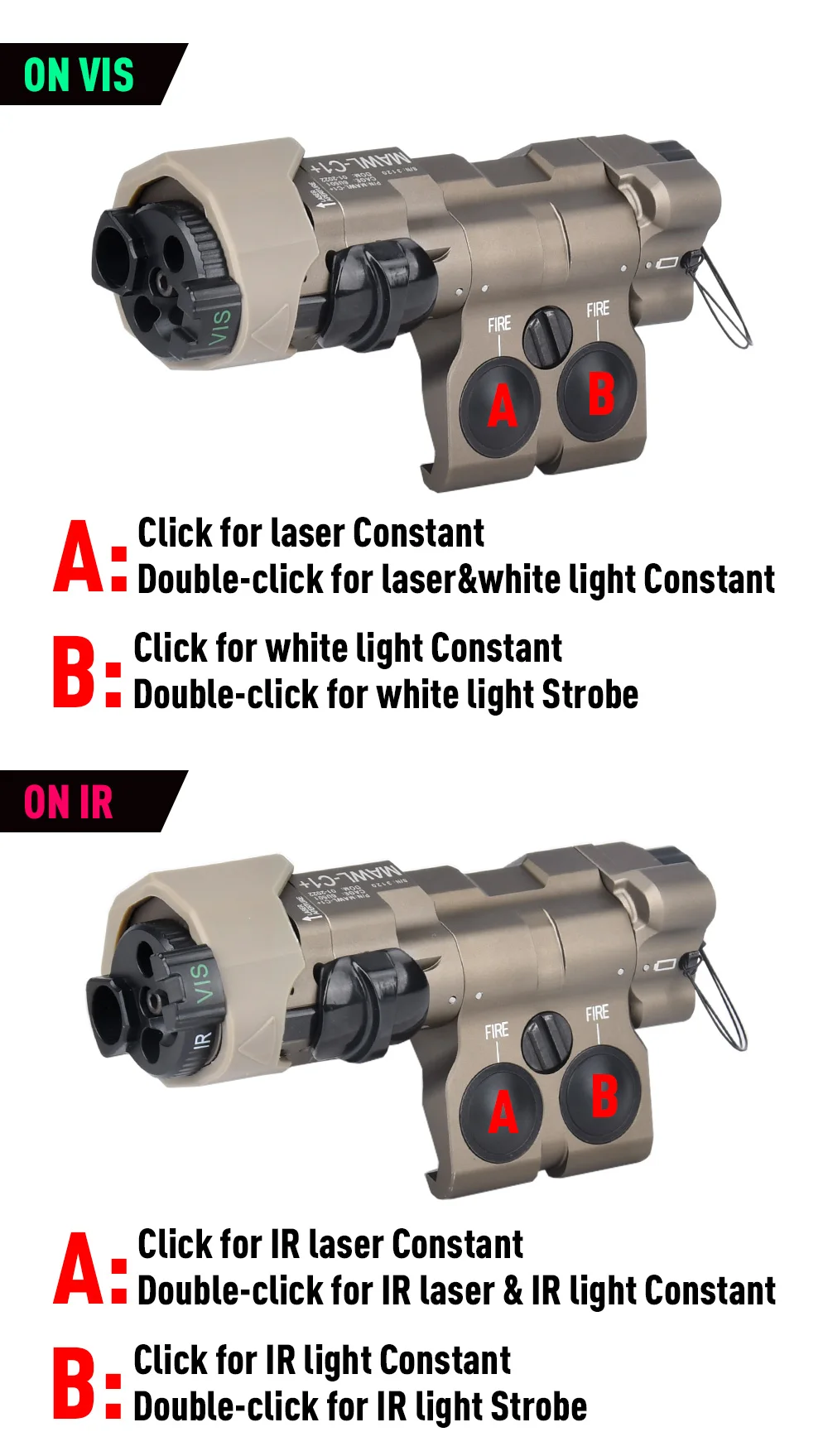 Láser verde + luz blanca + láser IR + luz de relleno IR