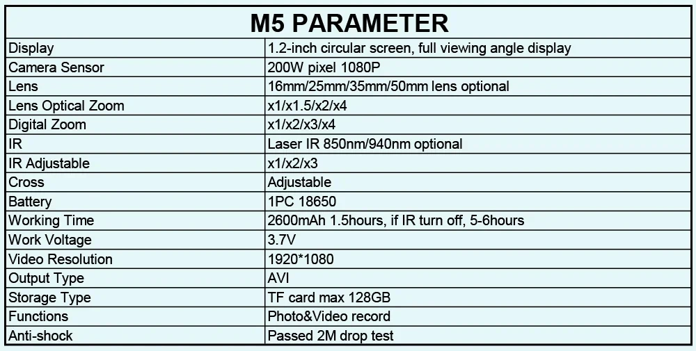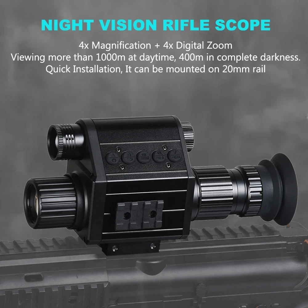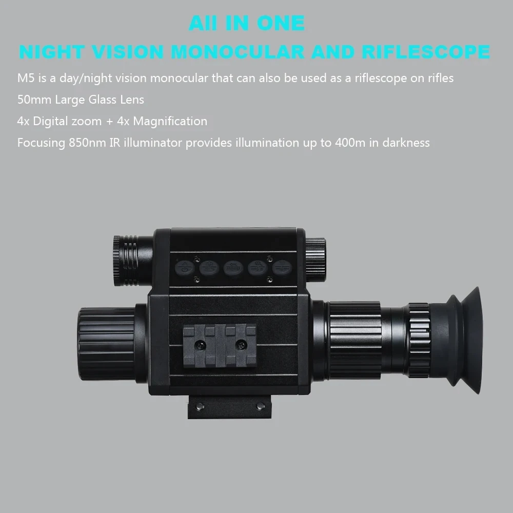 2, DÍA DE VISIONES CLARAS Y NOCHE: M5 cuenta con un sensor CMOS FHD 1080P de 2 MP, lente objetivo grande de 50 mm, aumento de 4x + zoom digital de 4x, iluminador IR láser de 850 nm incorporado con ajuste de niveles IR de 3 velocidades que permite observar animales de más de 3280 pies/1000 m durante el día, hasta 1310 pies/400 m en completa oscuridad, claramente por la noche.Puede ver imágenes Full HD directamente en el ocular grande.